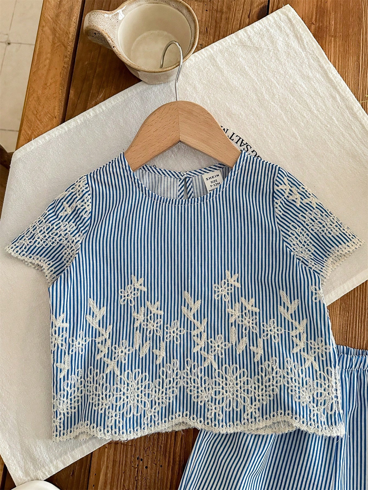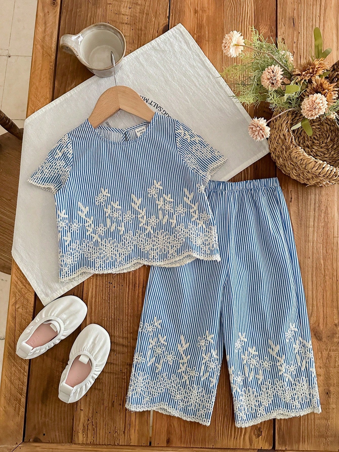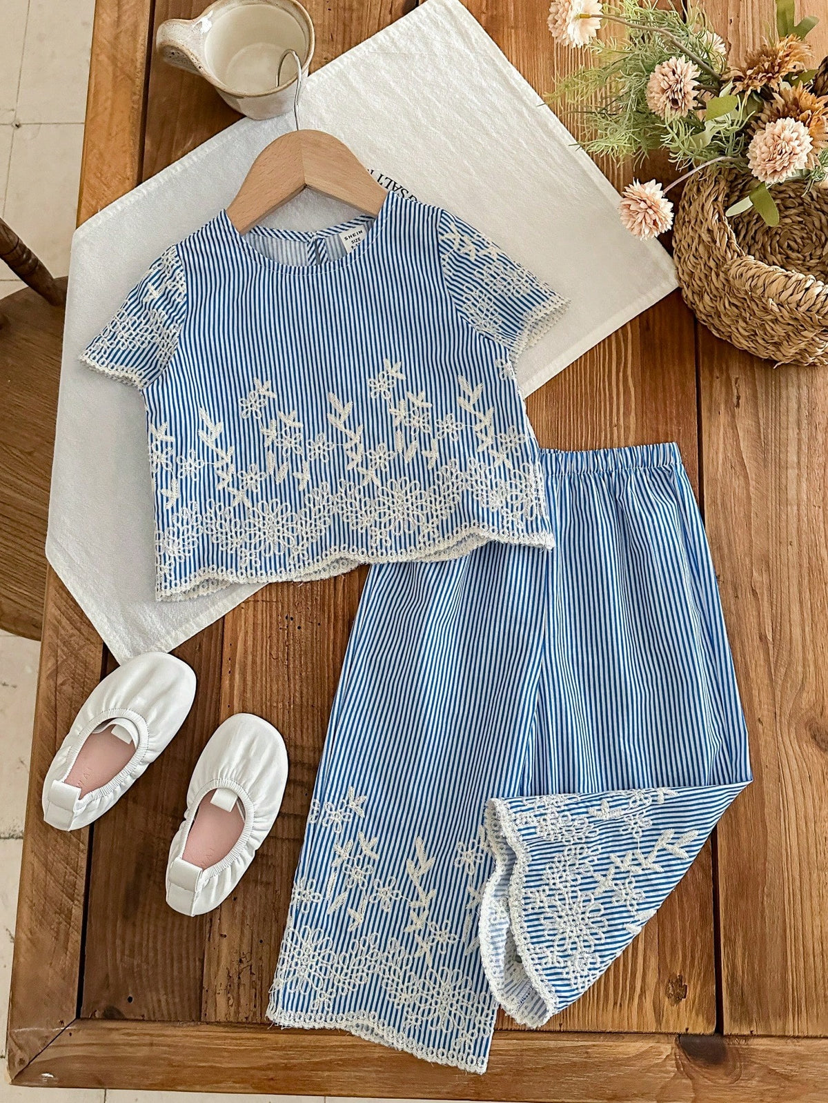Stripe Floral Top Pants Set - Blue / 4Y-7Y