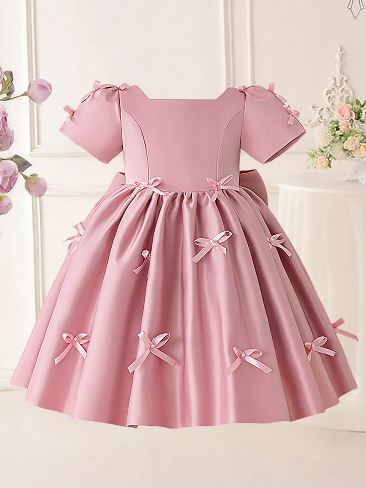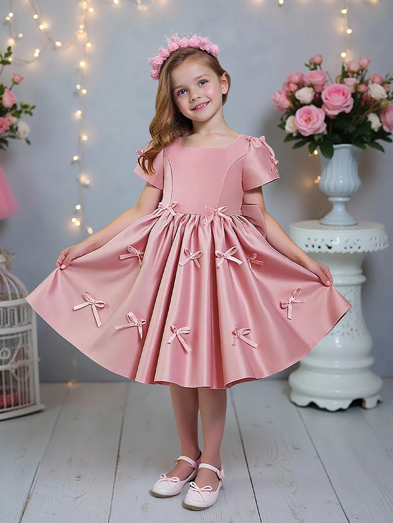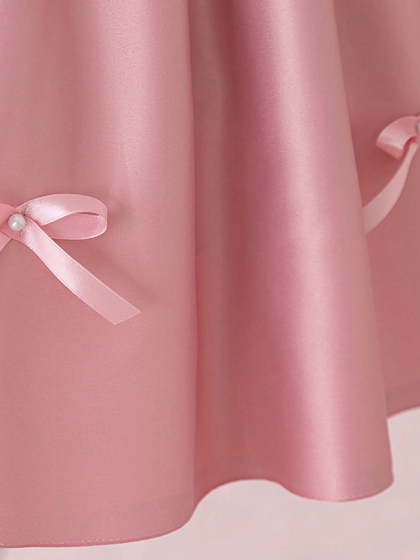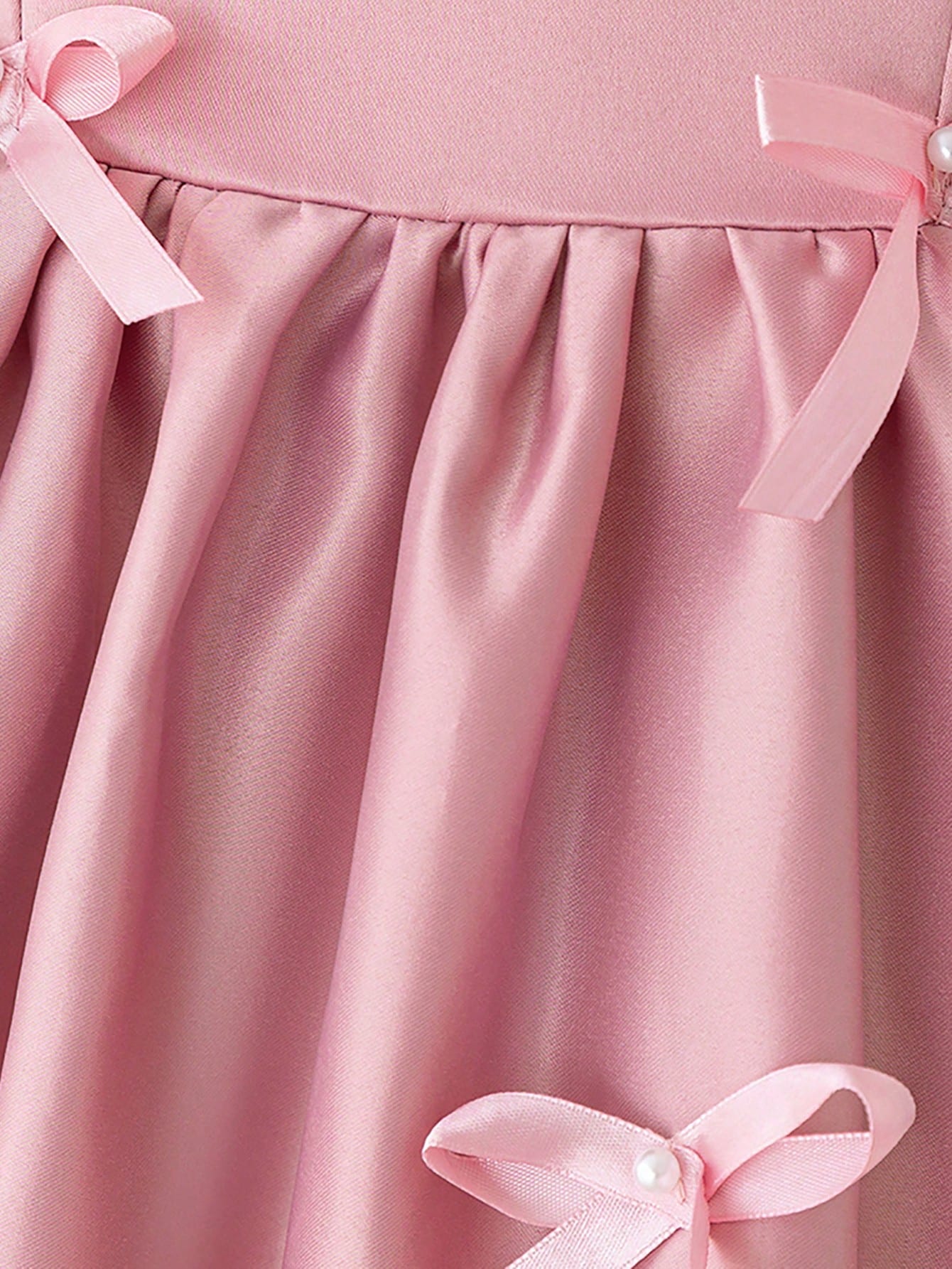 This elegant pearl-beaded satin dress features a soft satin finish with a stunning bow accent and faux-pearl detailing. Designed with a classic square neckline and perfect fit for parties, birthdays, weddings, and school events.