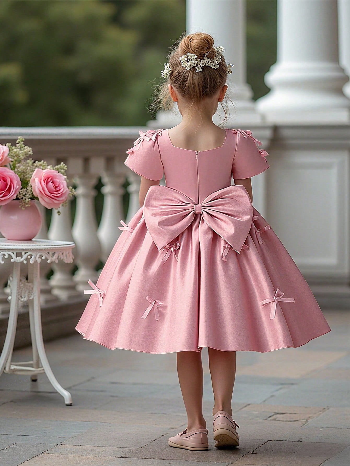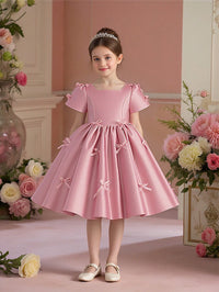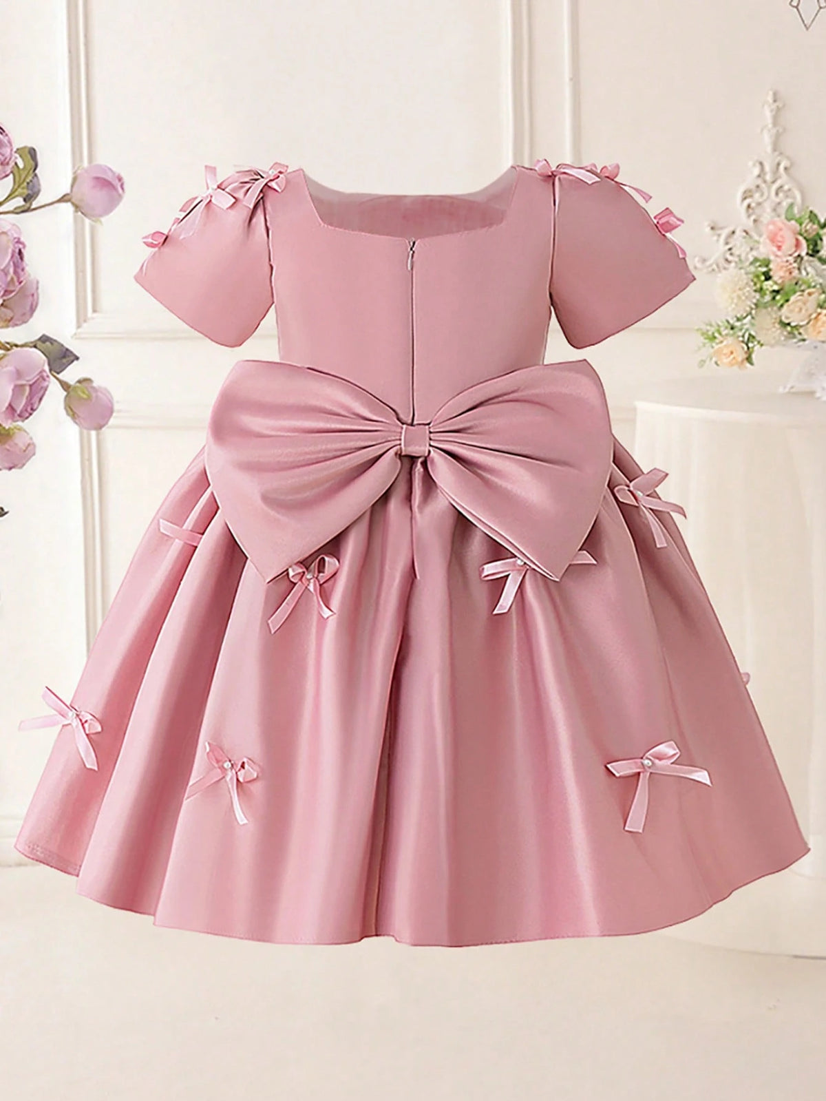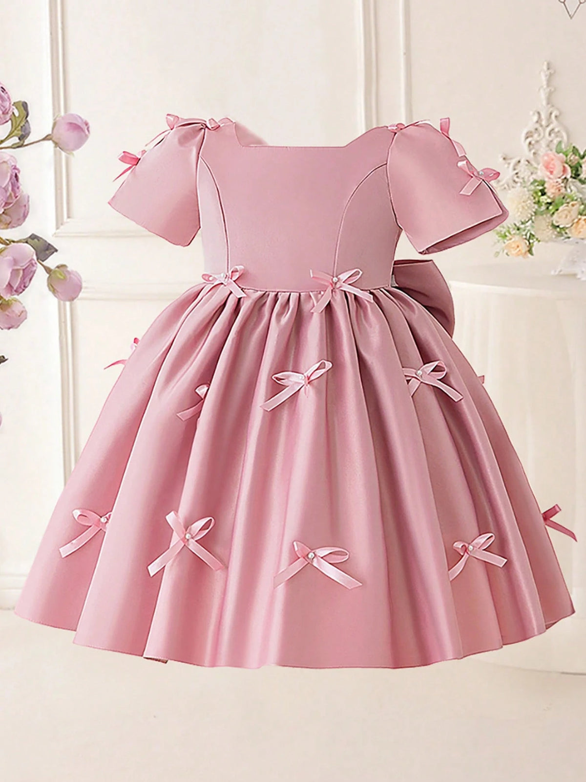 This elegant pearl-beaded satin dress features a soft satin finish with a stunning bow accent and faux-pearl detailing. Designed with a classic square neckline and perfect fit for parties, birthdays, weddings, and school events.