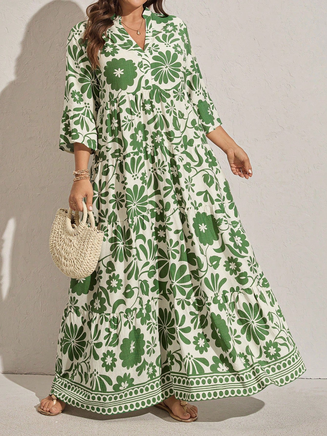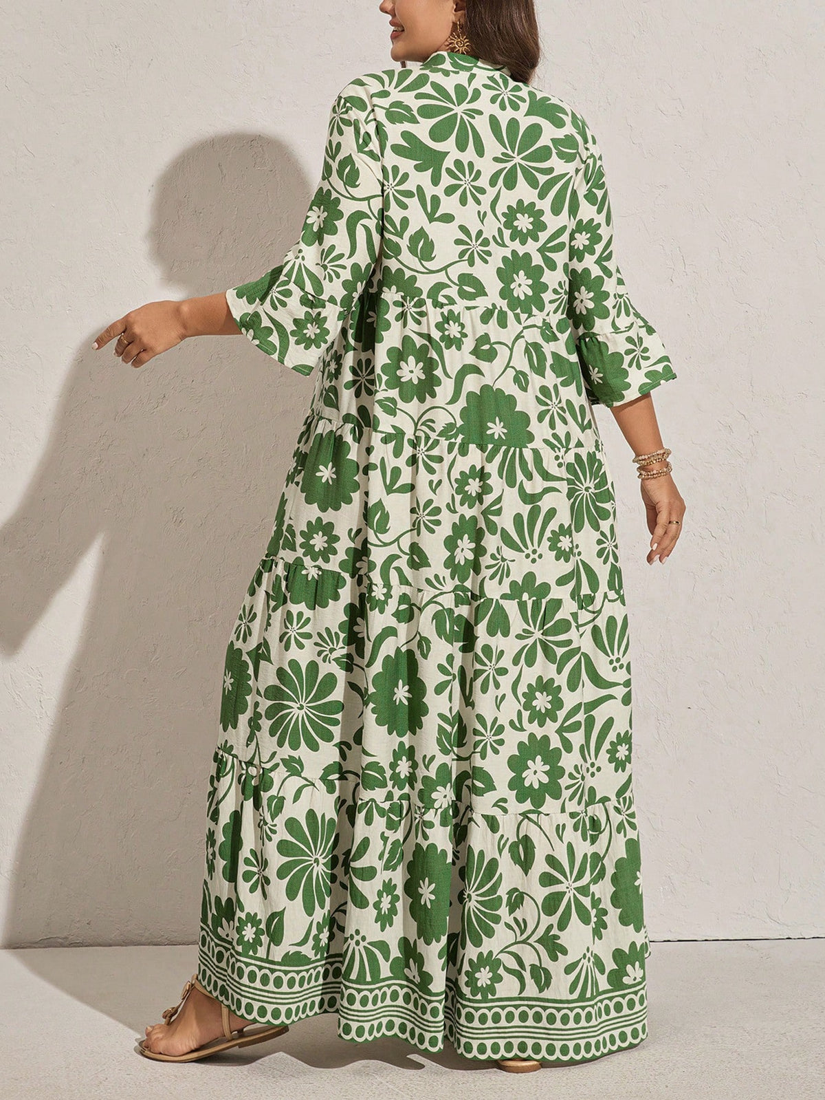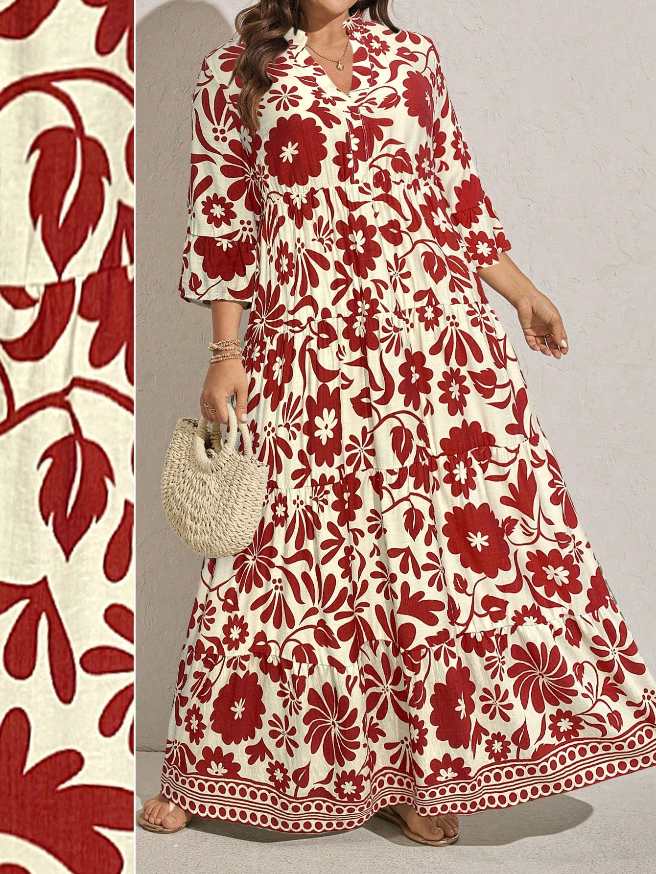 Bring effortless vacation style with this plus-size floral print maxi dress featuring flare sleeves and a ruffle hem. Its relaxed, flowy fit makes it ideal for beach outings, summer vacations, or casual weekend wear.
