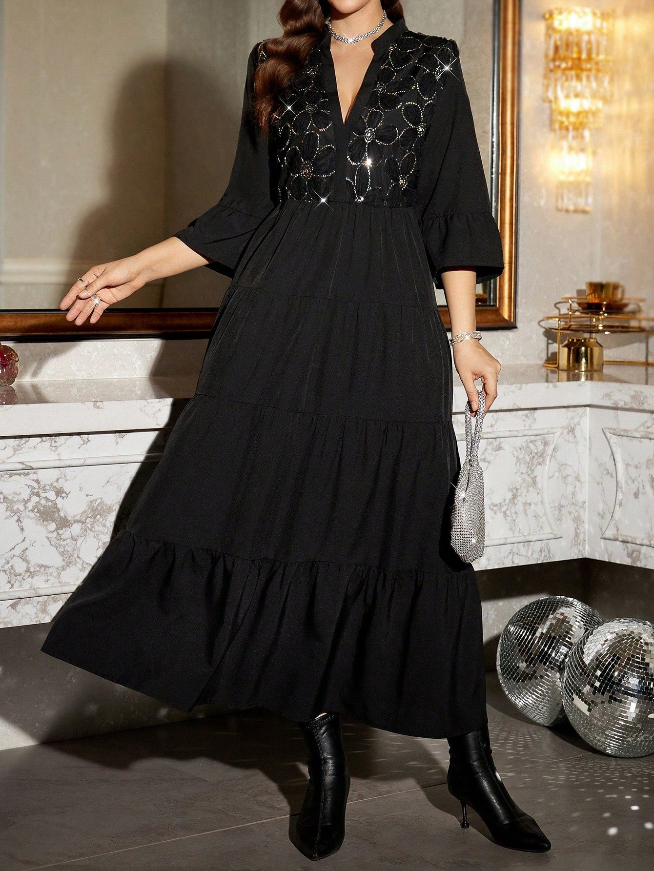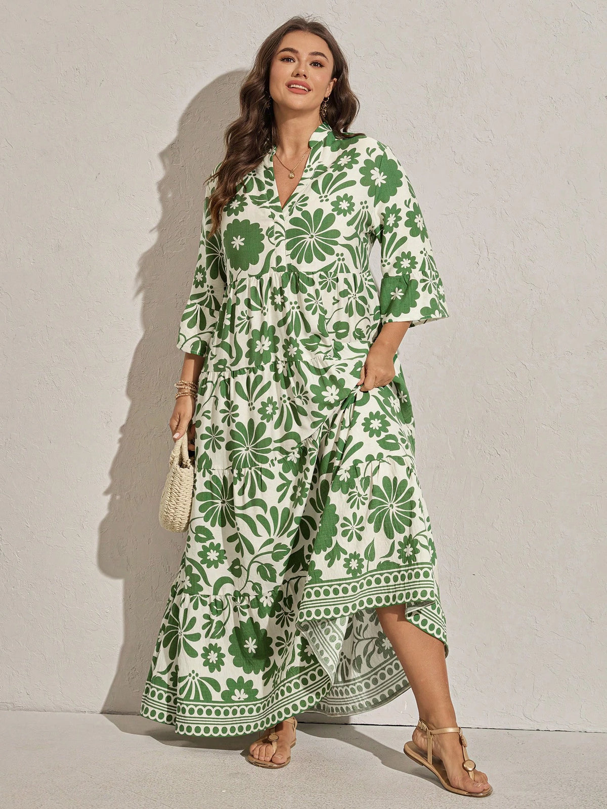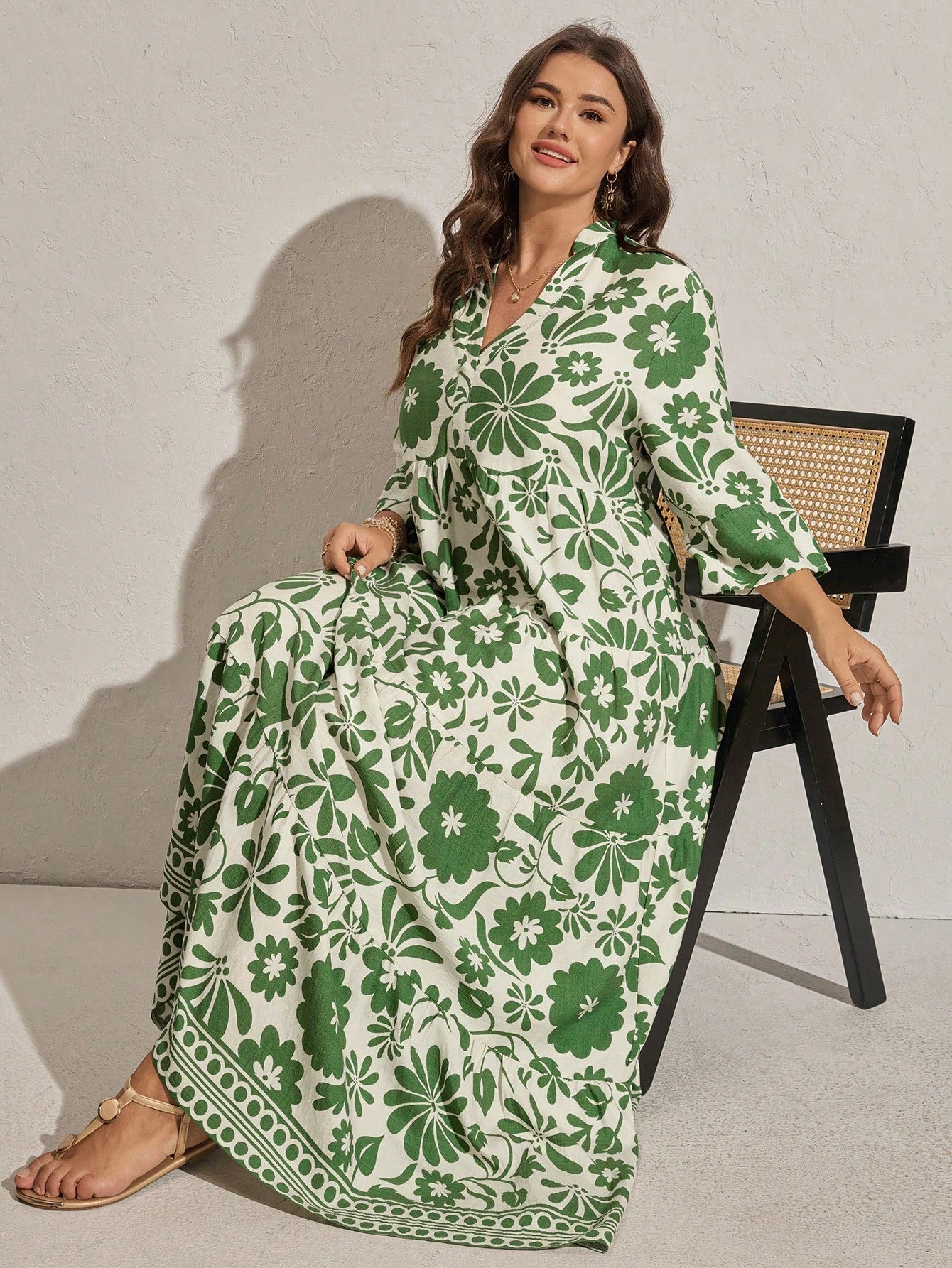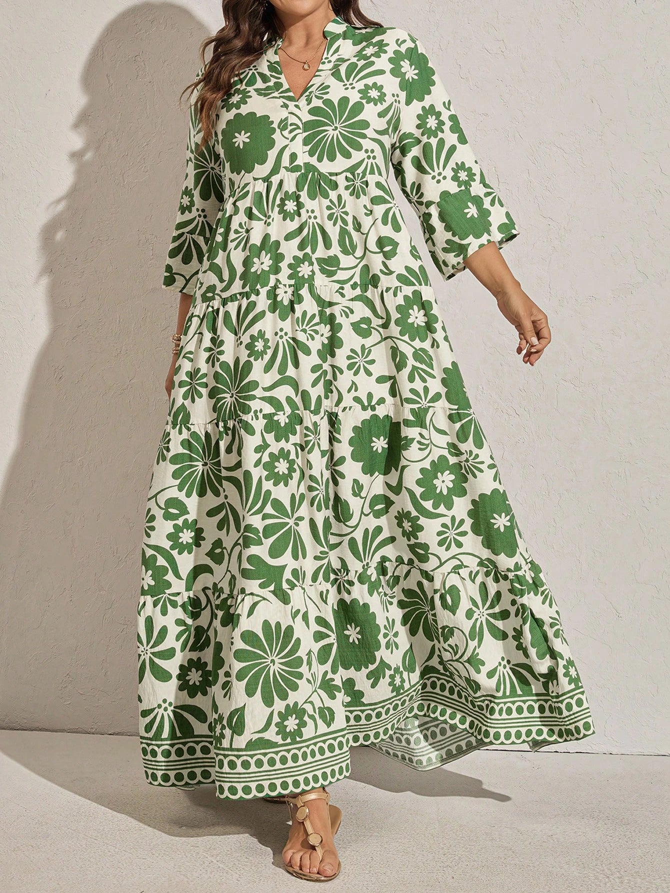 Bring effortless vacation style with this plus-size floral print maxi dress featuring flare sleeves and a ruffle hem. Its relaxed, flowy fit makes it ideal for beach outings, summer vacations, or casual weekend wear.