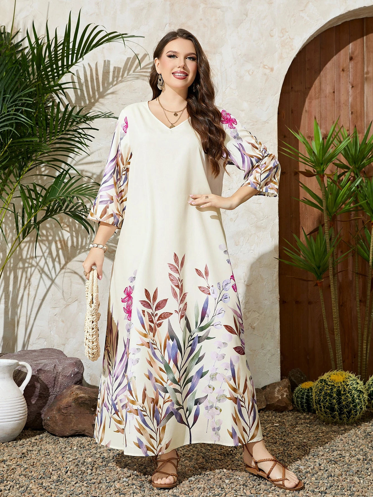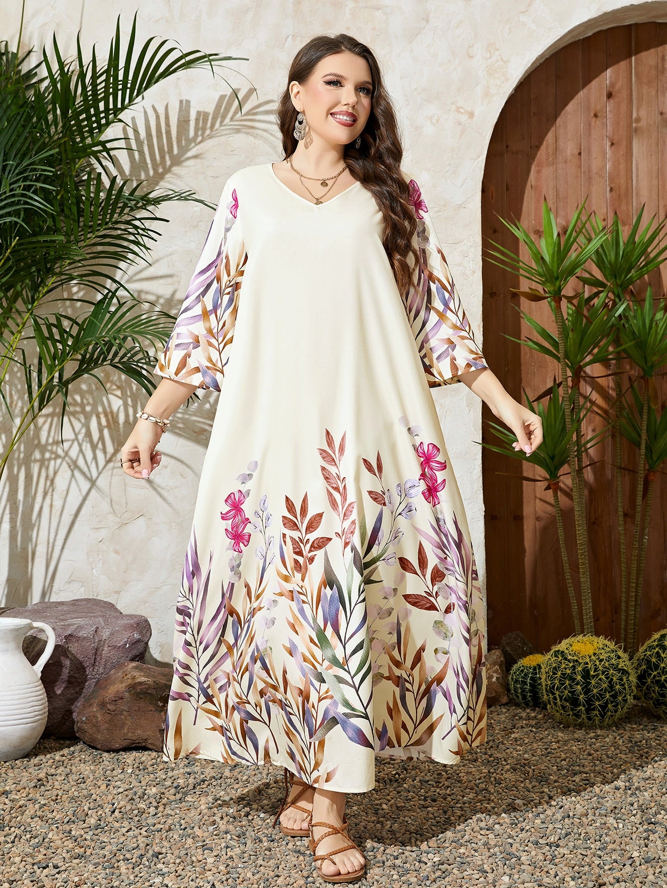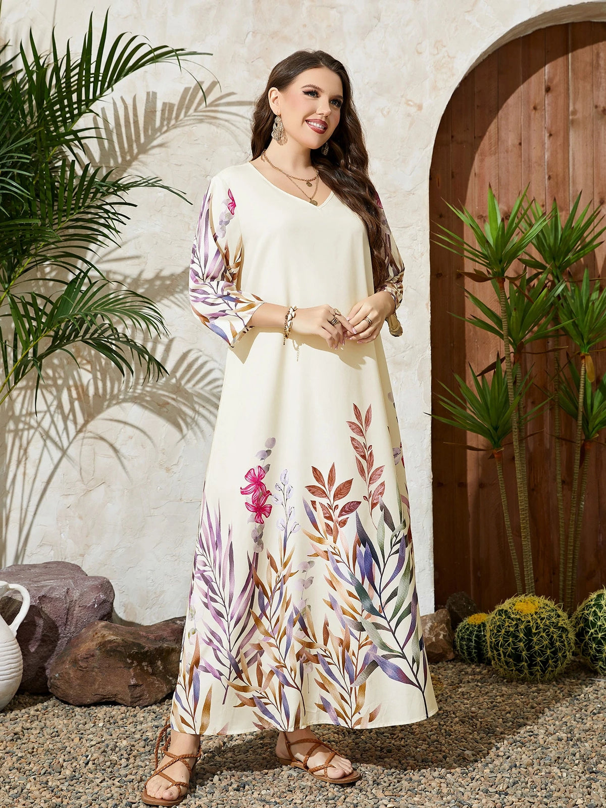 Flowing and feminine, this floral-print V-neck tunic maxi dress offers a relaxed silhouette and effortless curve elegance. Ideal for casual days or a stepped-up look with minimal styling.