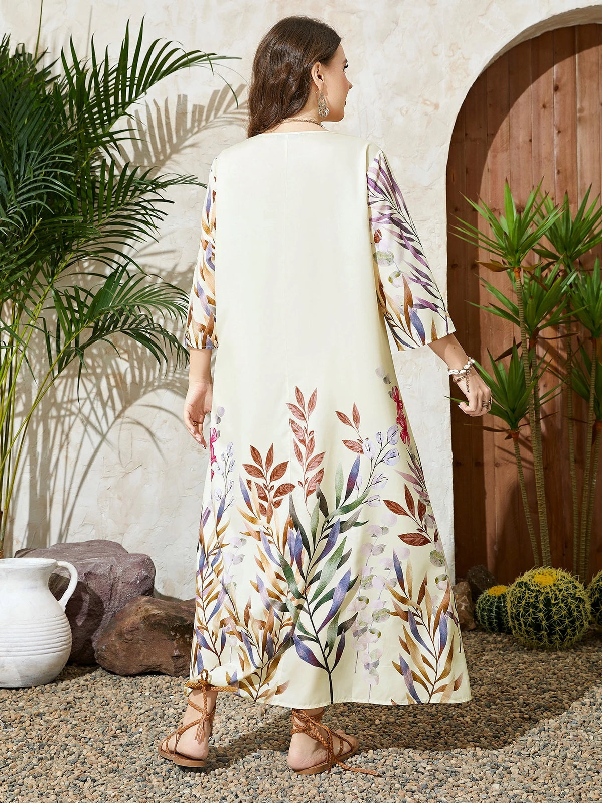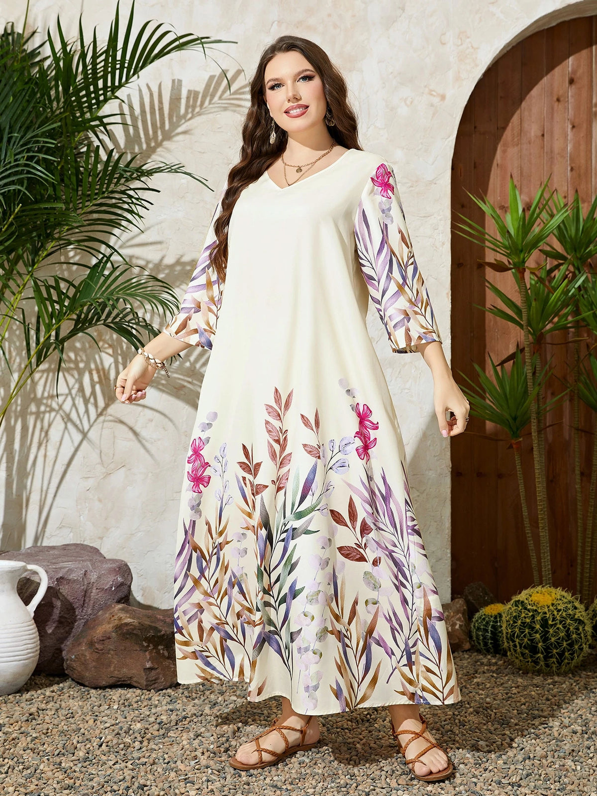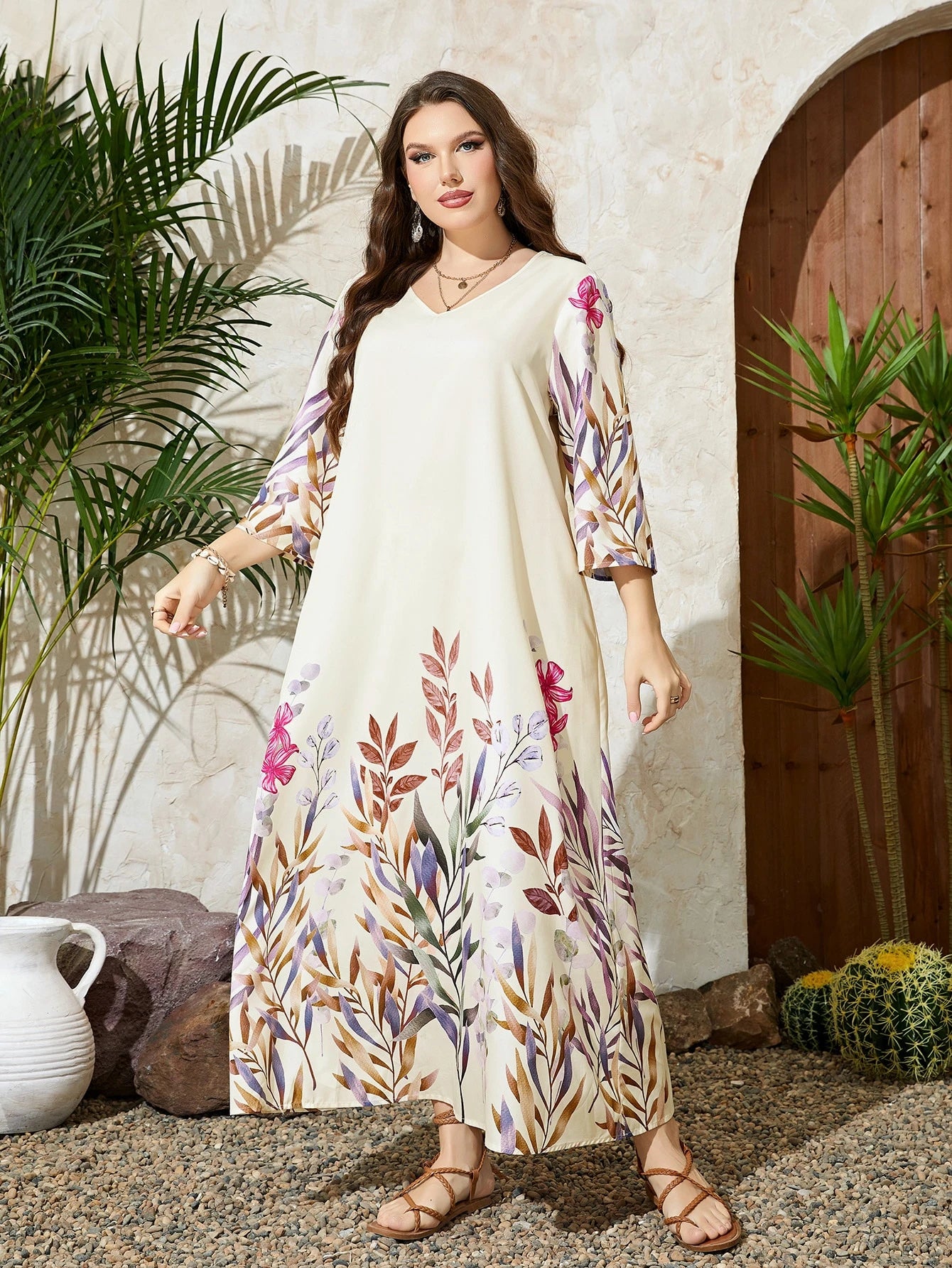 Flowing and feminine, this floral-print V-neck tunic maxi dress offers a relaxed silhouette and effortless curve elegance. Ideal for casual days or a stepped-up look with minimal styling.