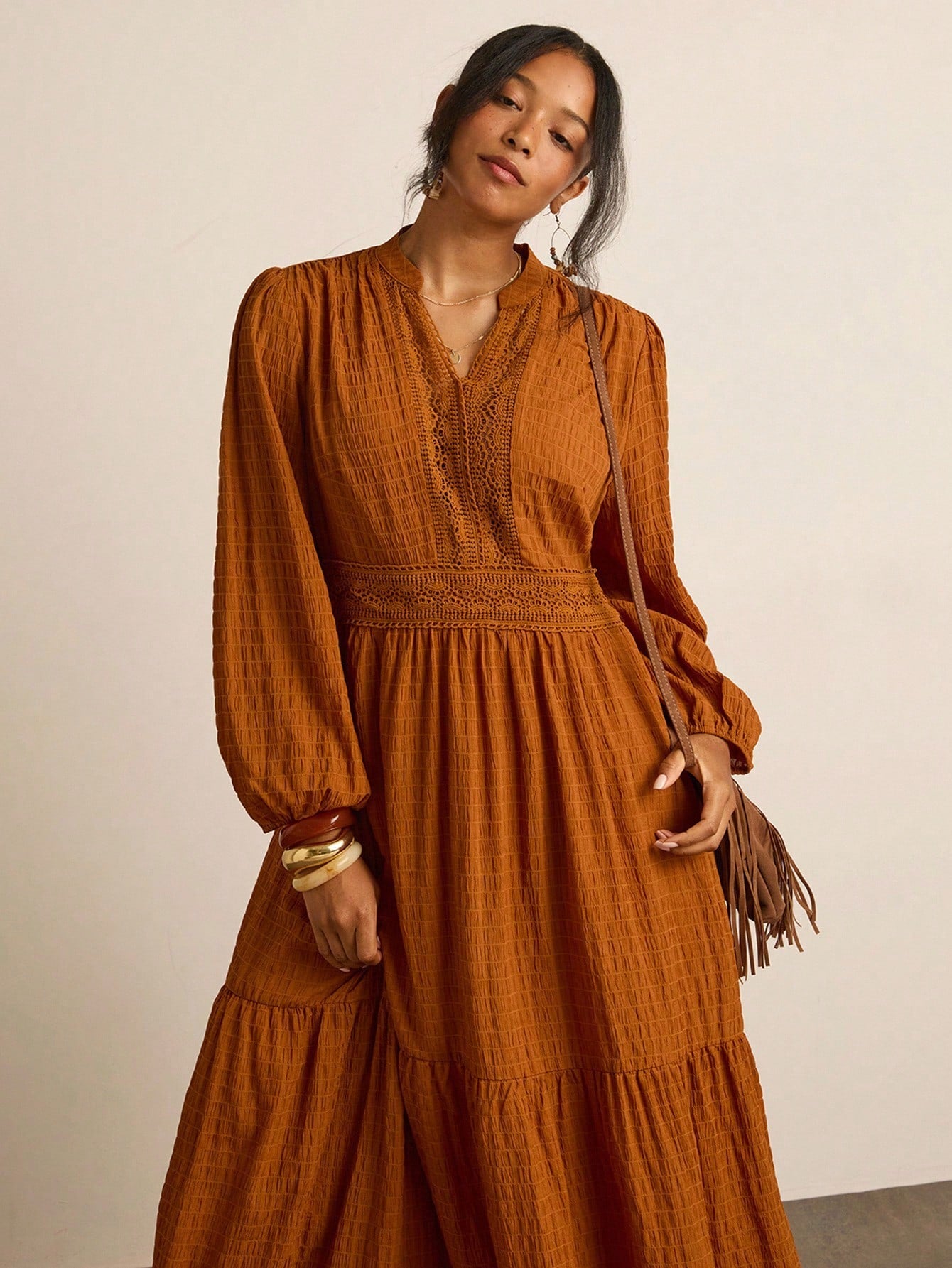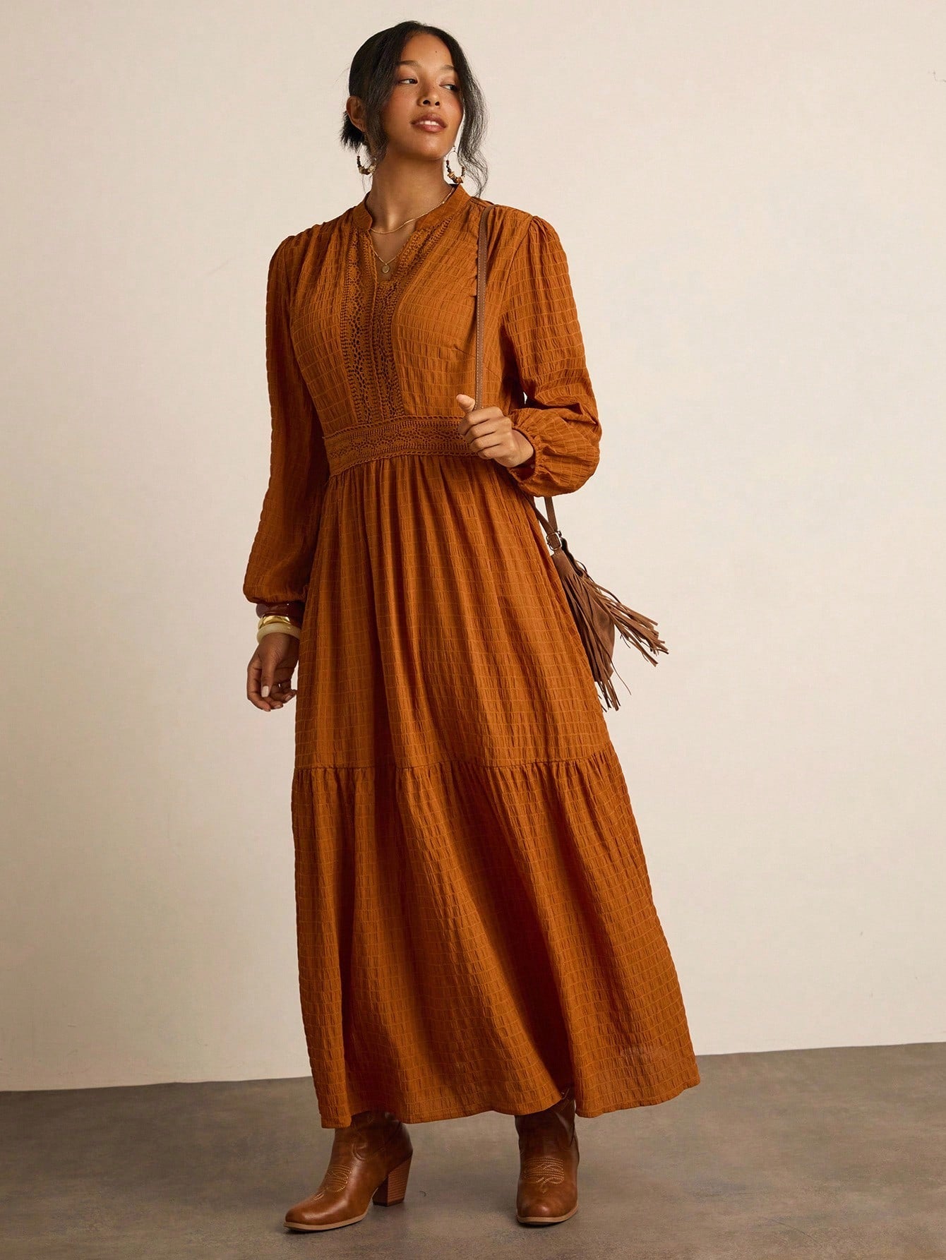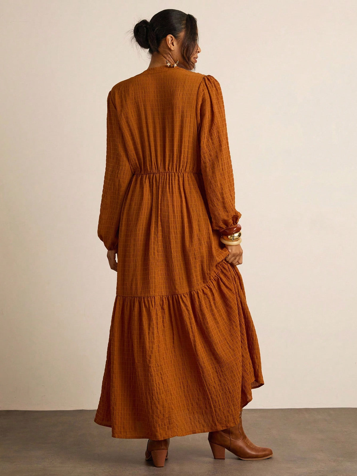 Enjoy effortless comfort and casual style with this plus-size solid color V-neck maxi dress. Made with textured non-woven, non-elastic fabric, this long-sleeve dress features a relaxed fit perfect for everyday wear or casual outings.