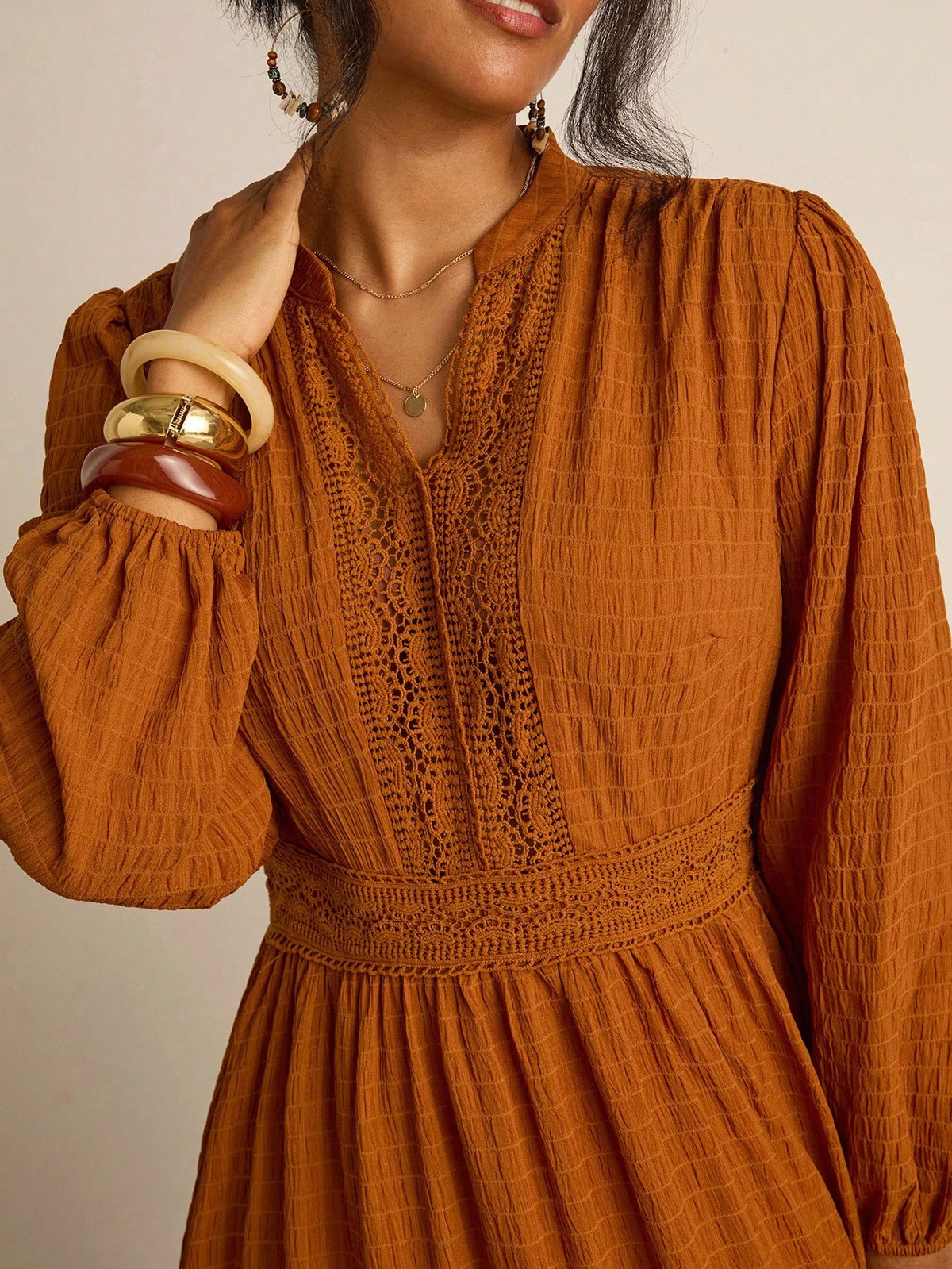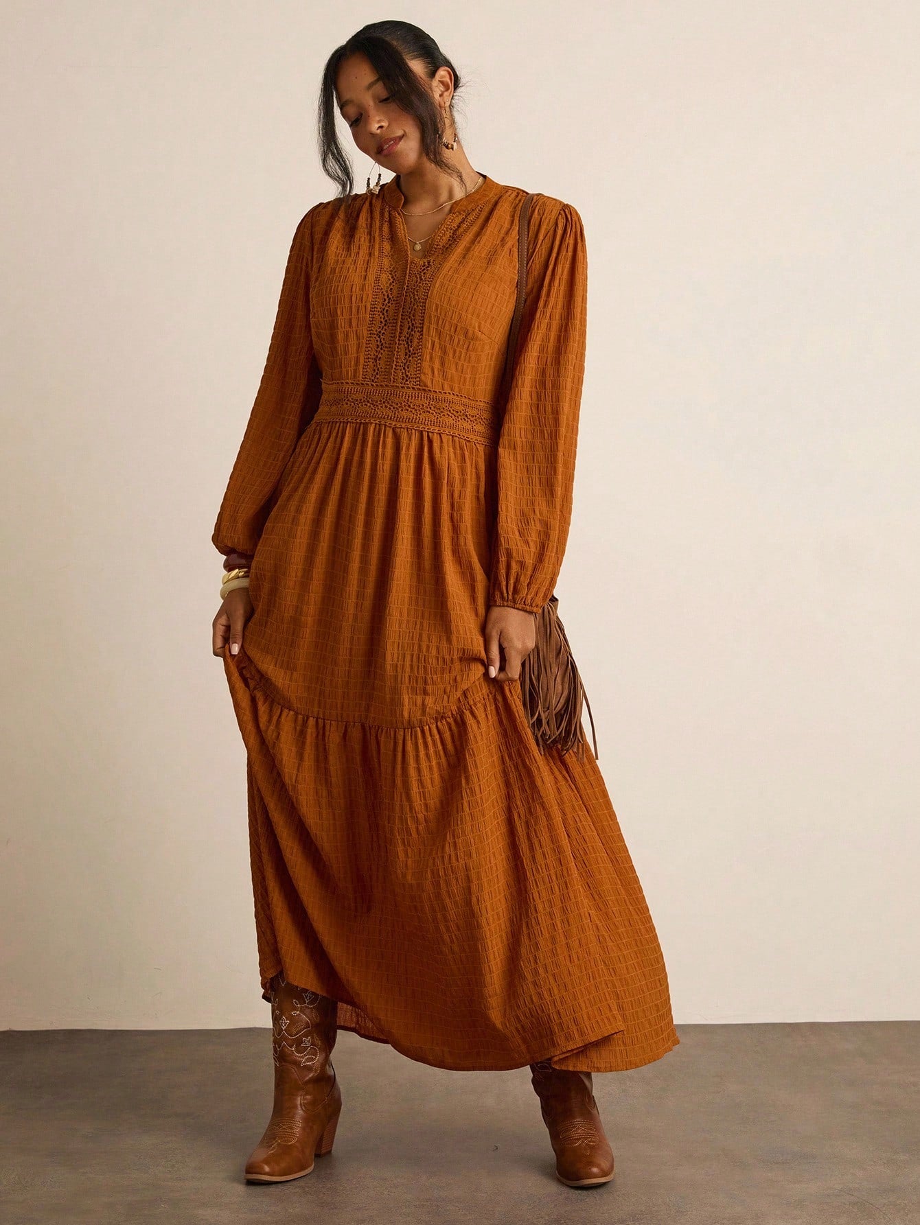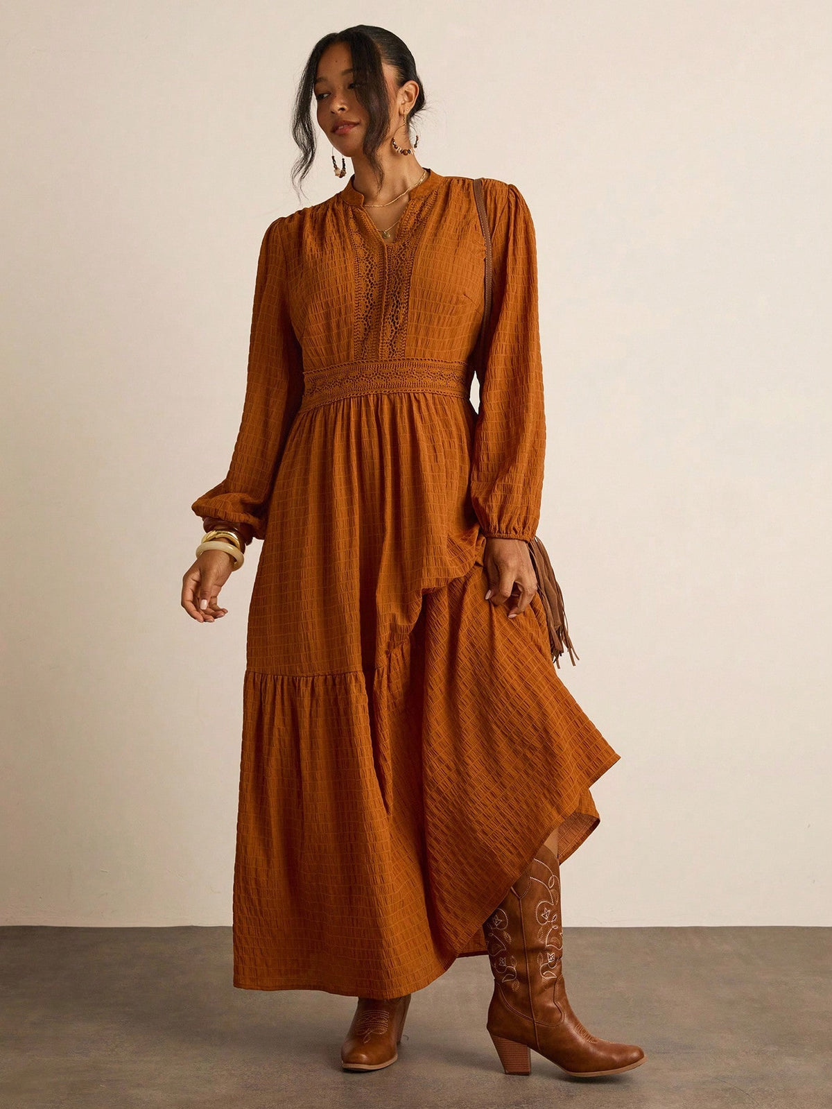 Enjoy effortless comfort and casual style with this plus-size solid color V-neck maxi dress. Made with textured non-woven, non-elastic fabric, this long-sleeve dress features a relaxed fit perfect for everyday wear or casual outings.