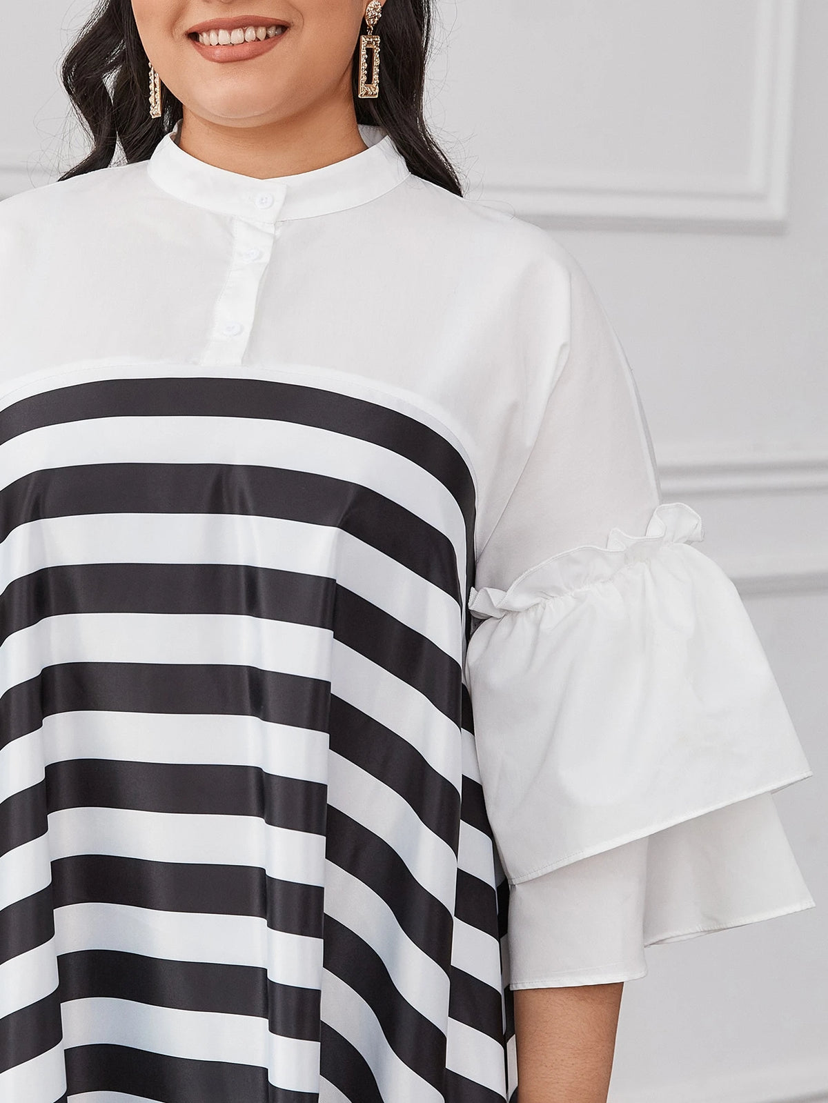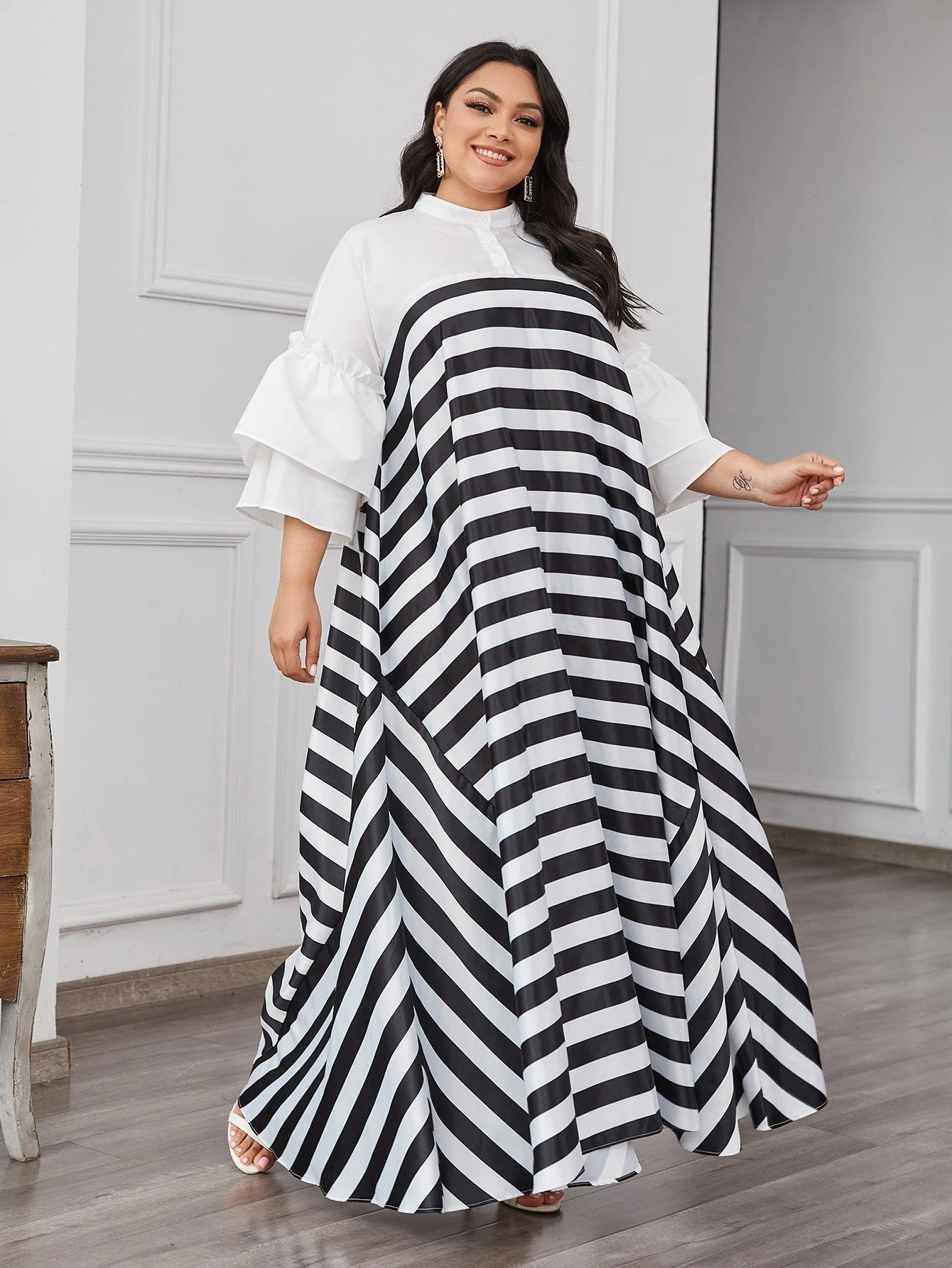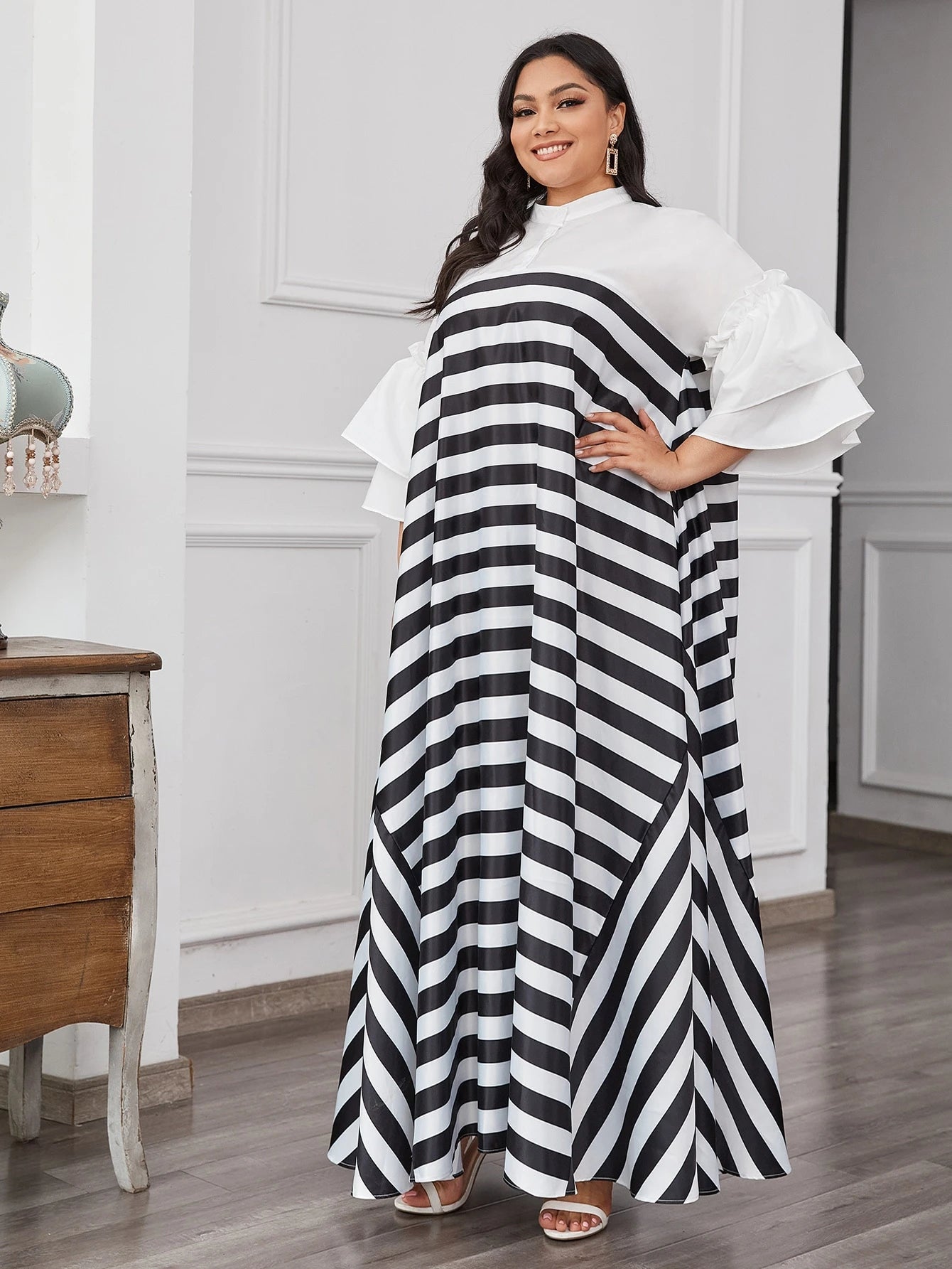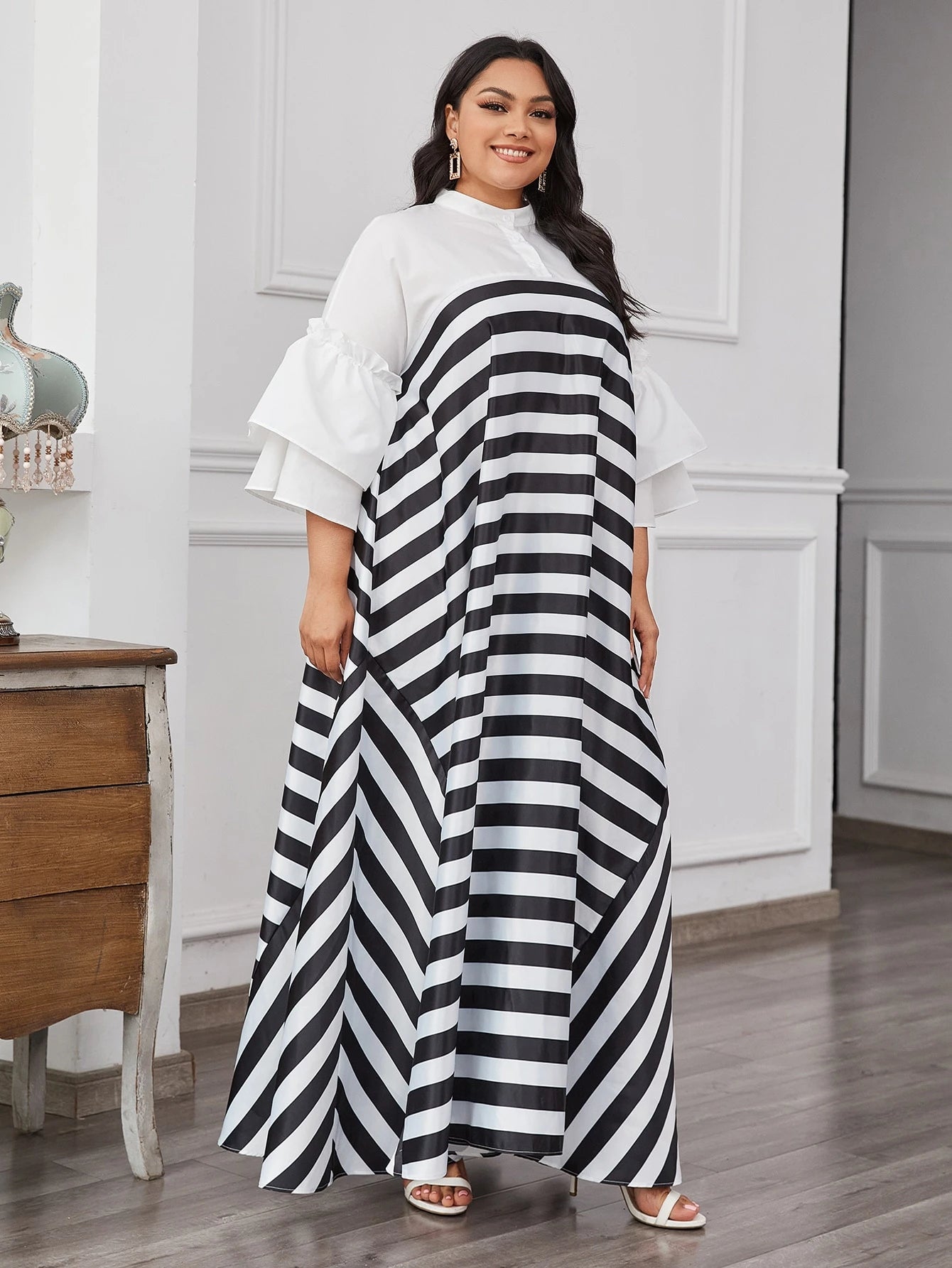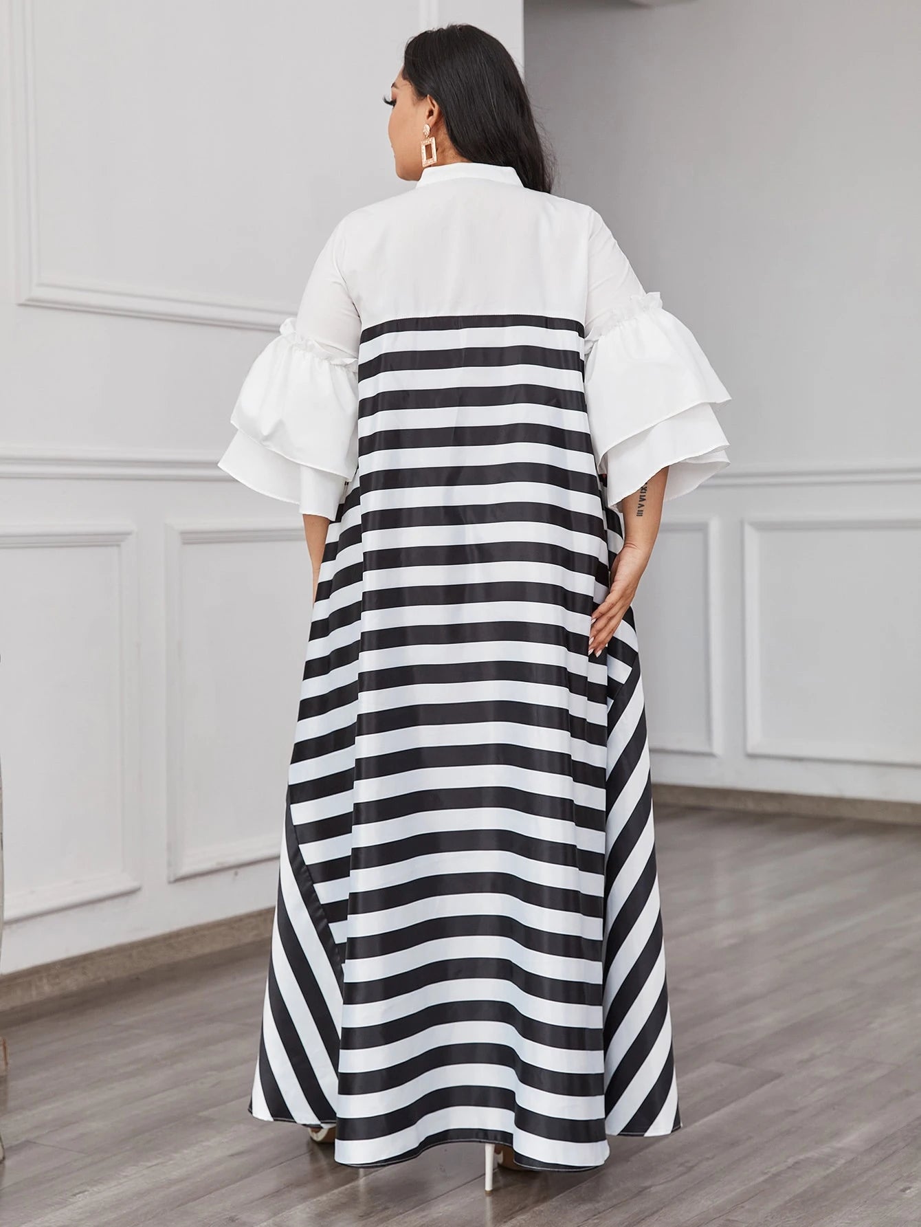Add effortless style to your wardrobe with this two-tone striped maxi dress featuring flounce sleeves and a half-placket neckline. Relaxed fit designed to flatter curves while providing comfort for daily wear or casual outings.