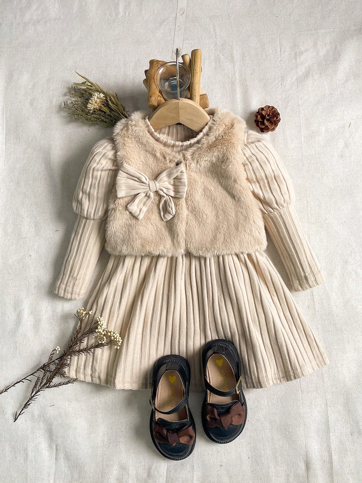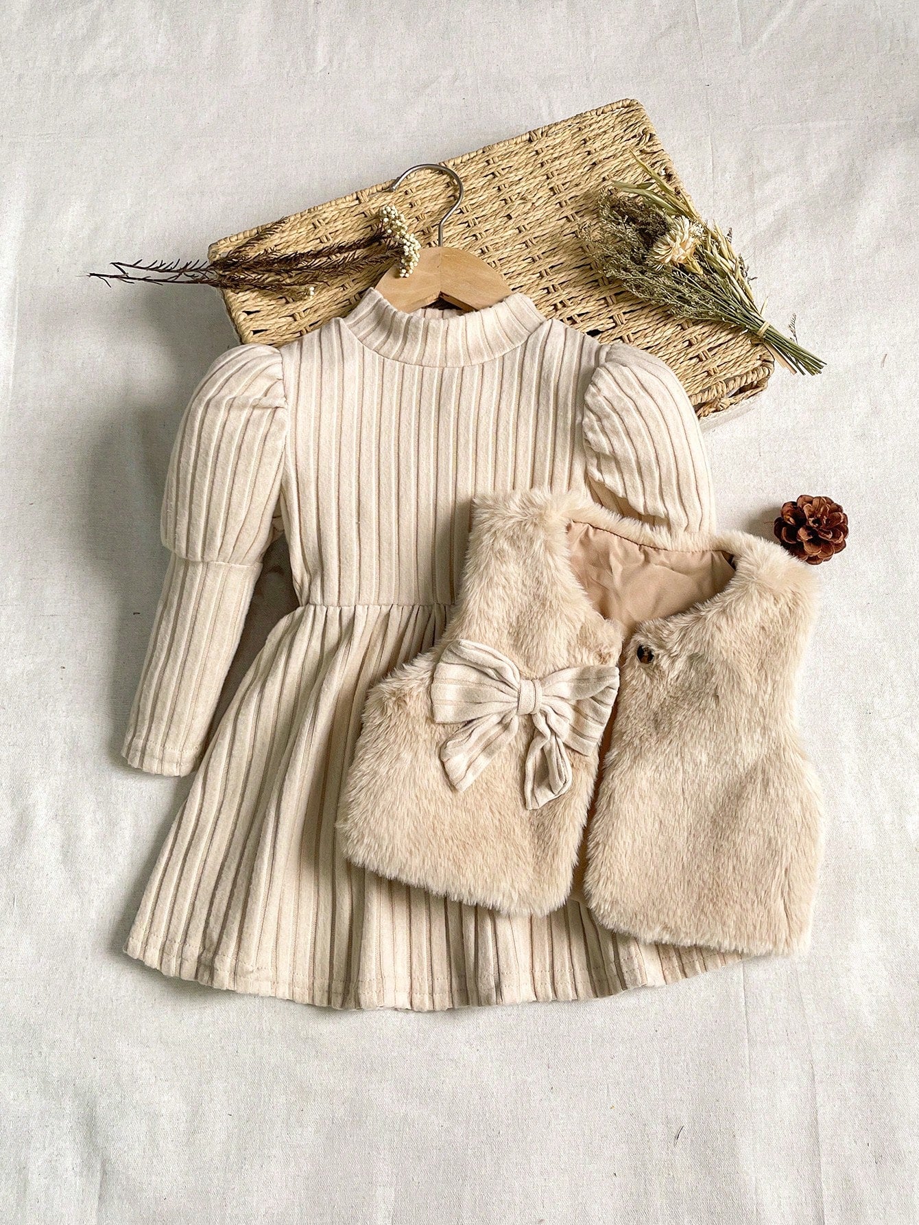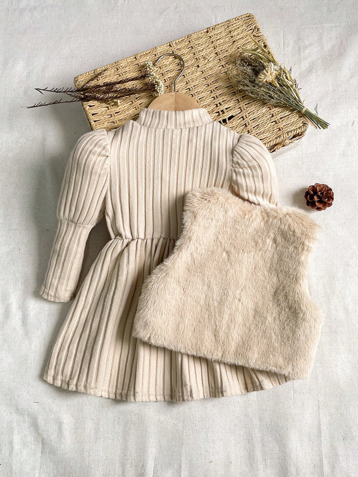 Charming 2‑piece baby girls set includes a long sleeve ruched lantern sleeve dress and a cozy plush vest jacket. Soft, warm, and stylish for daily outings, birthdays, or festive occasions. Ages 6M-3Y.