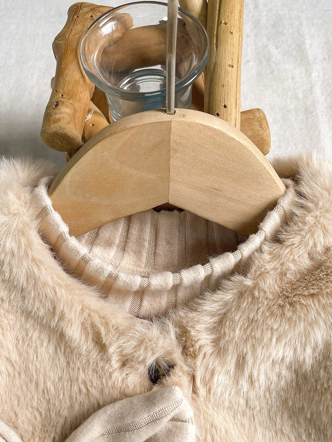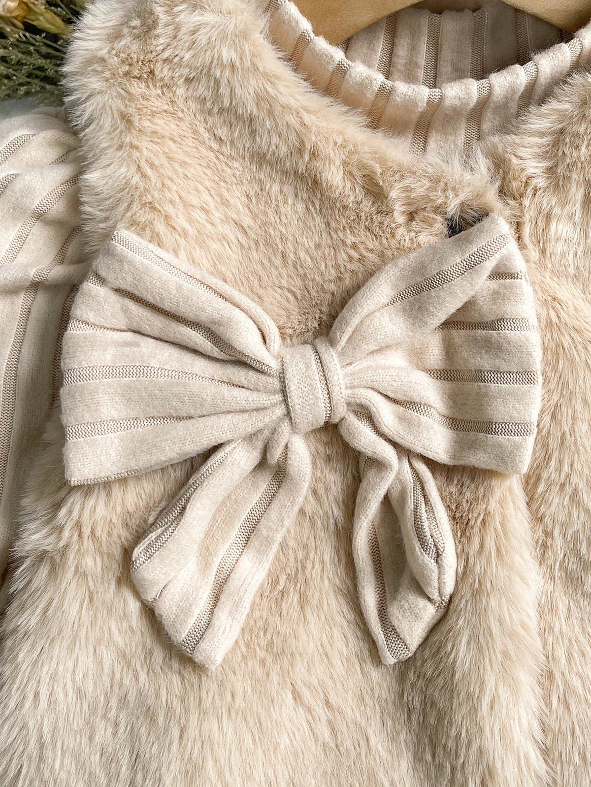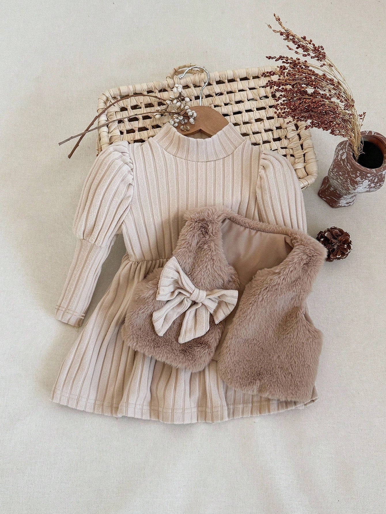 Charming 2‑piece baby girls set includes a long sleeve ruched lantern sleeve dress and a cozy plush vest jacket. Soft, warm, and stylish for daily outings, birthdays, or festive occasions. Ages 6M-3Y.
