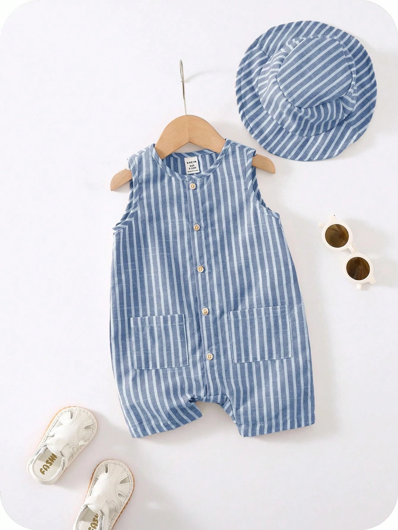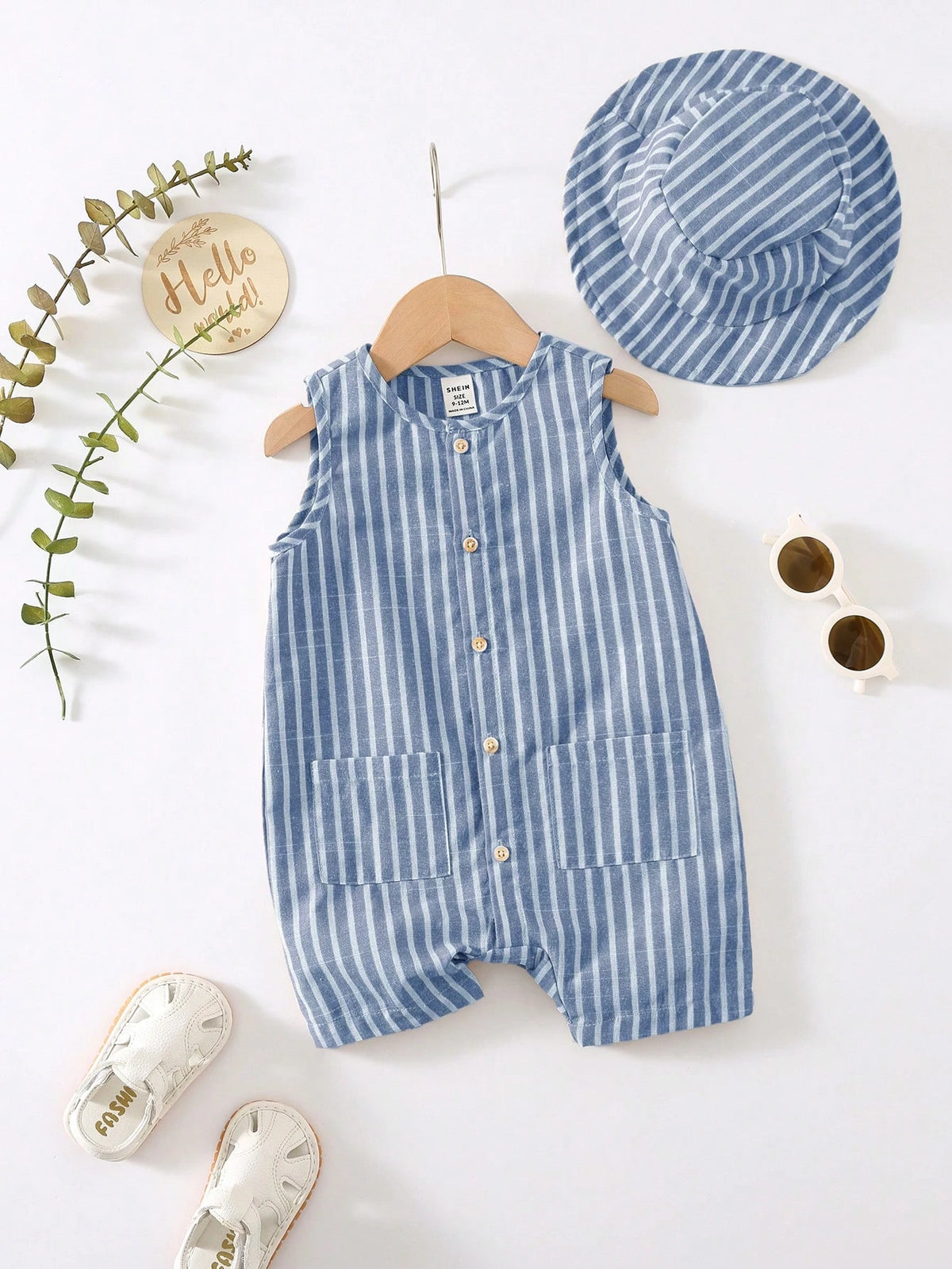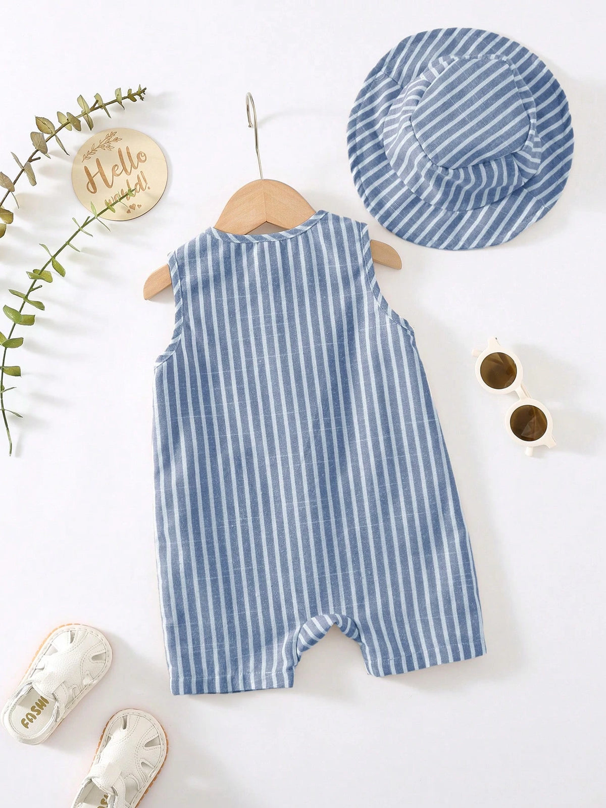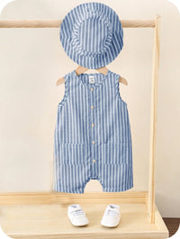 Bright, breezy, and ready for summer. This unisex 3-piece set includes a colorful striped sleeveless romper, matching shorts, and a cute bucket hat—perfect for travel, playdates, and sunny vacations. A comfy pick for newborn baby clothes and toddlers alike.
