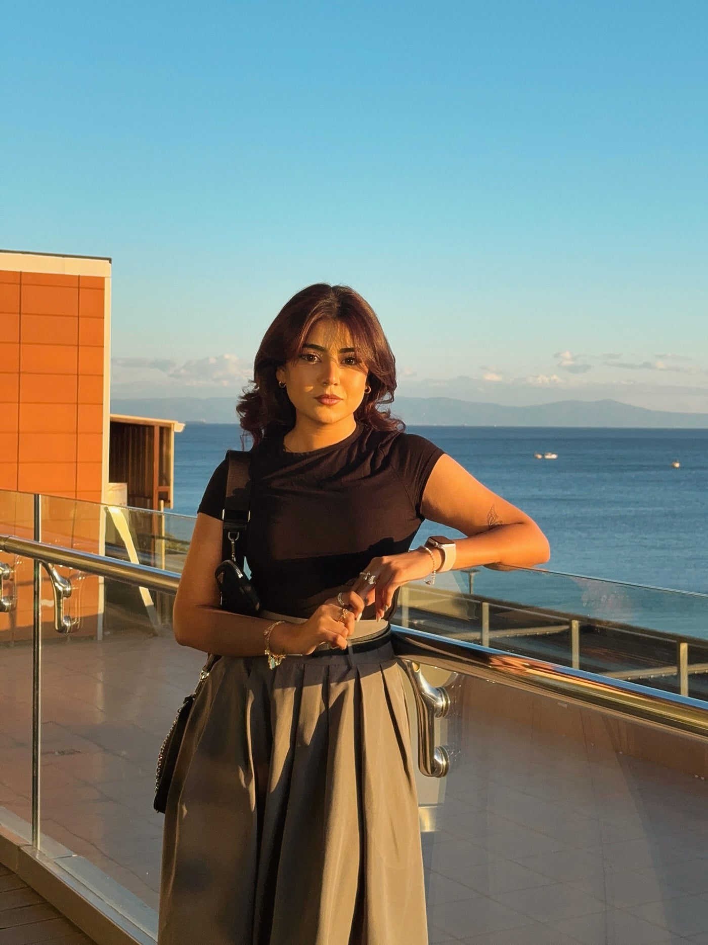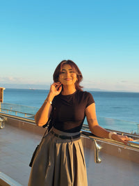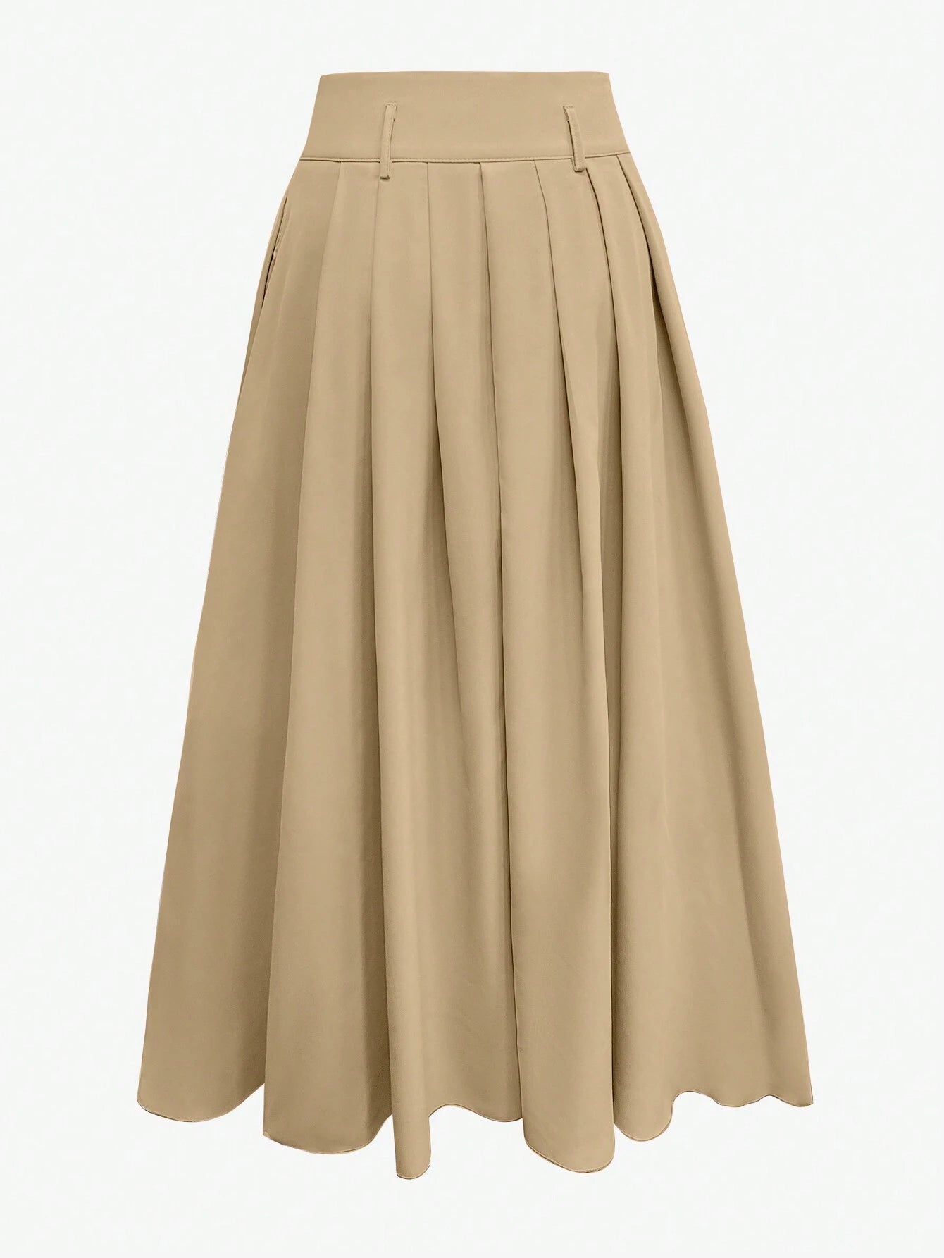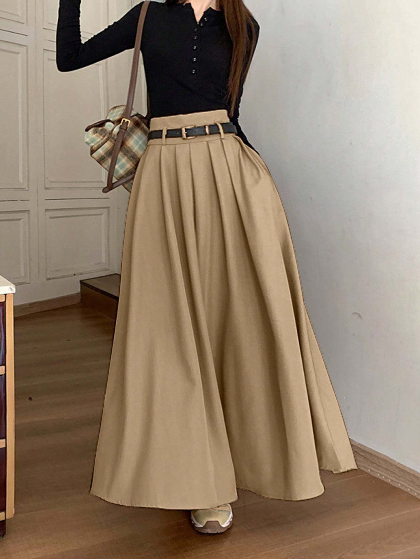 As worn by Areeka Haq, this high-waist pleated khaki maxi skirt combines elegance with everyday practicality. Designed with soft pleats, a belted waist, and convenient side pockets, it’s an influencer-approved wardrobe essential for modest, casual, or elevated looks.