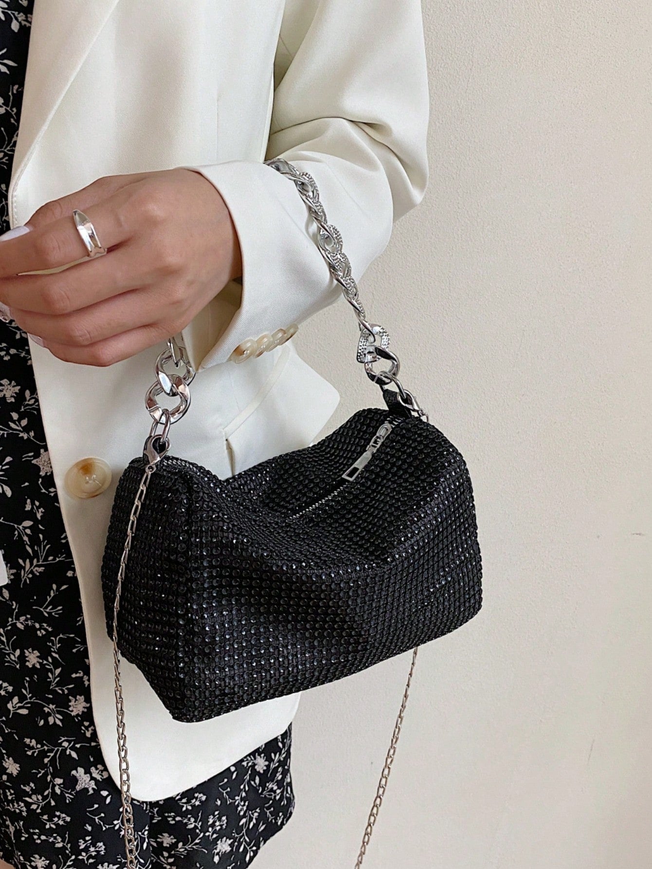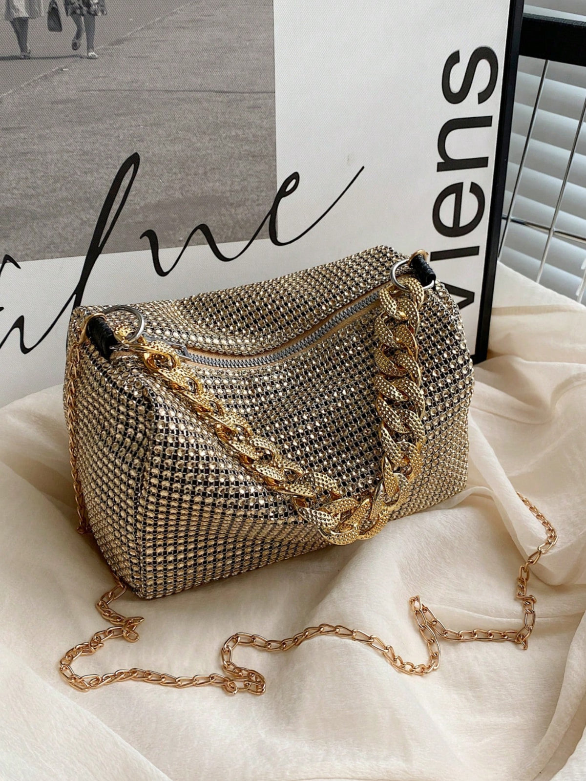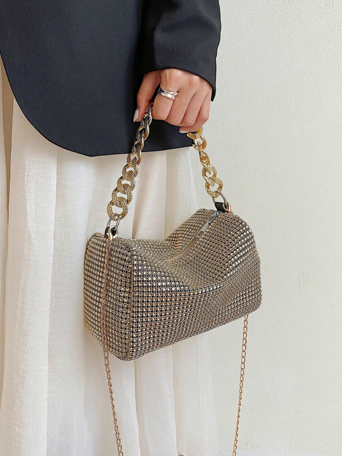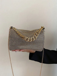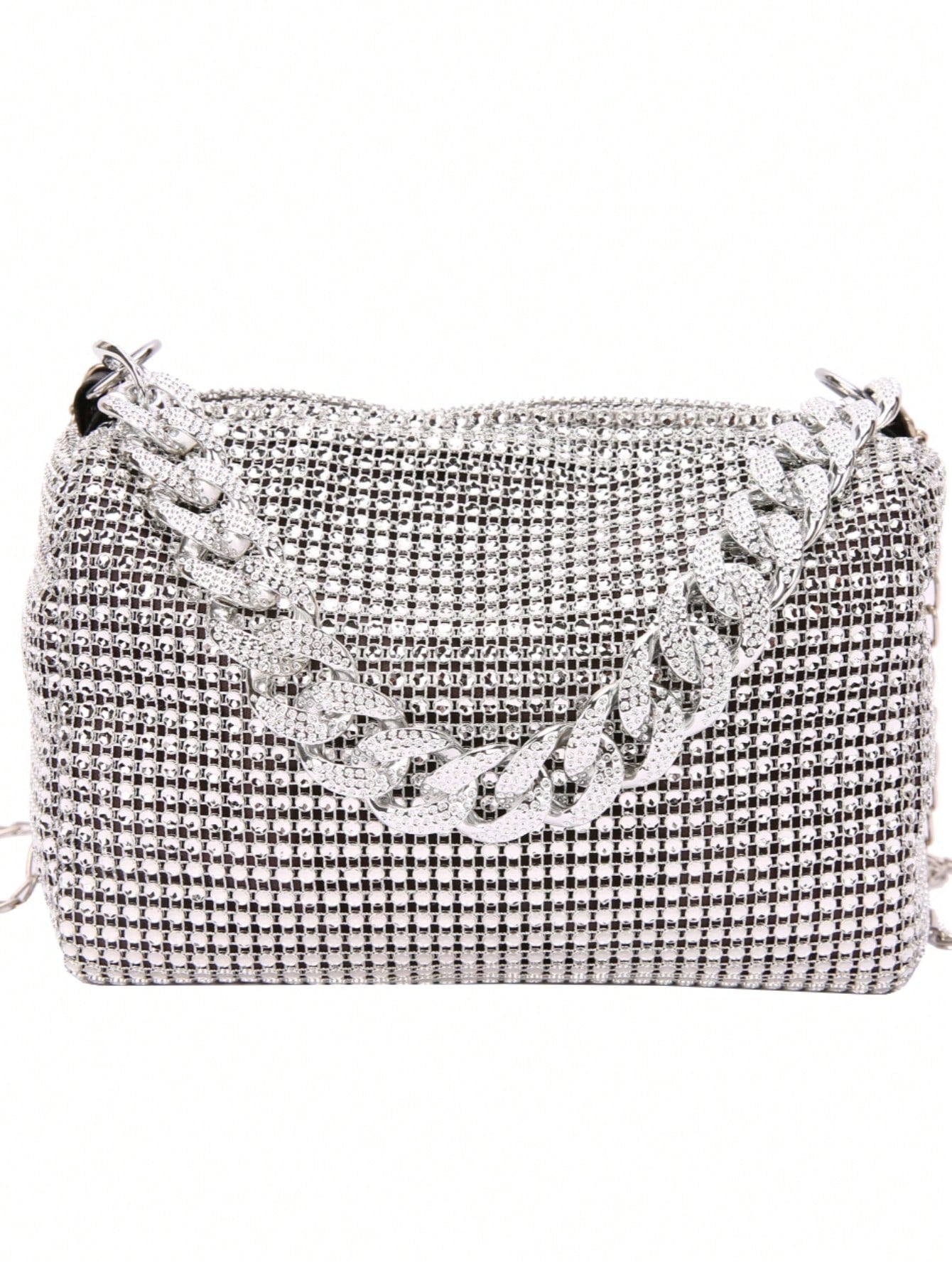 Add sparkle to your evening look with this shiny rhinestone crossbody bag, designed with a hollow metal chain strap and a secure zipper closure. Perfect for parties, weddings, proms, dinners, and banquets, this bag complements your holiday dresses, sequins, and evening outfits. Lightweight yet glamorous, it’s a must-have accessory for special occasions.