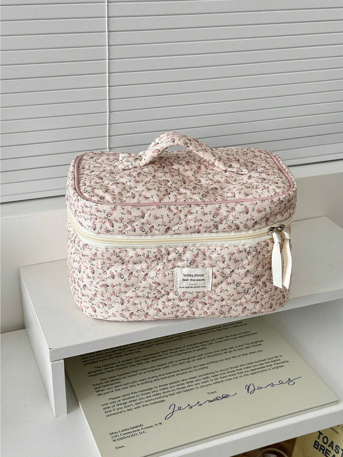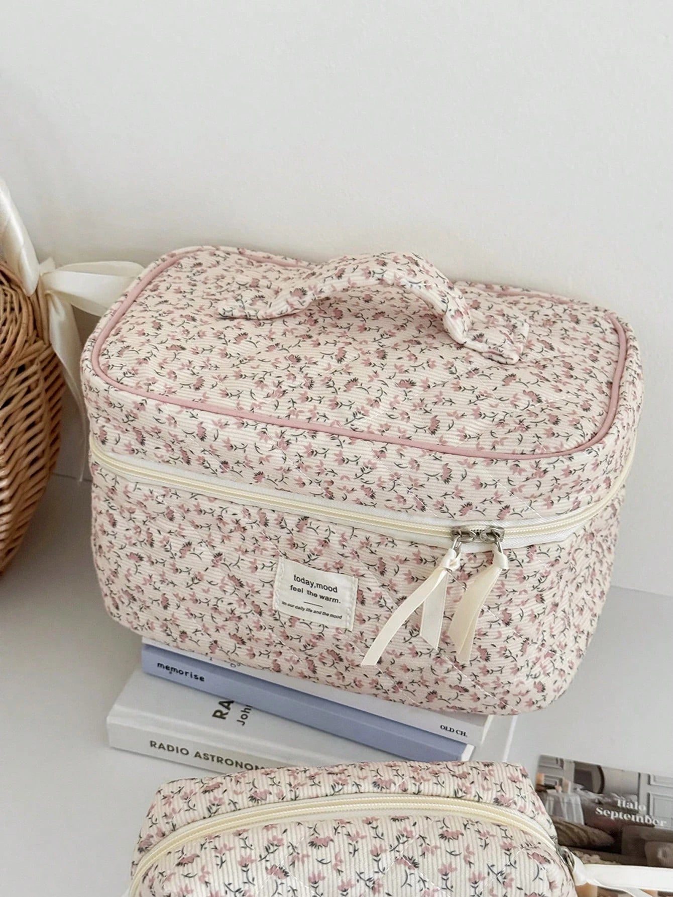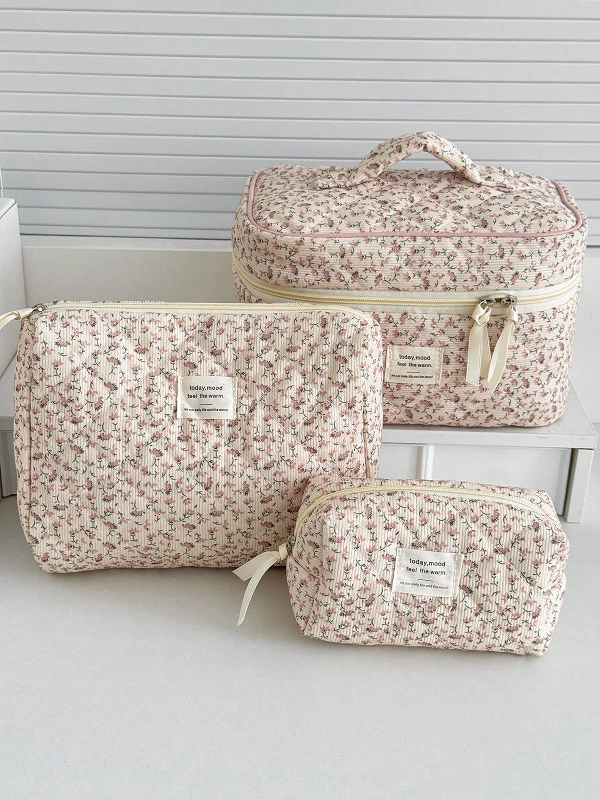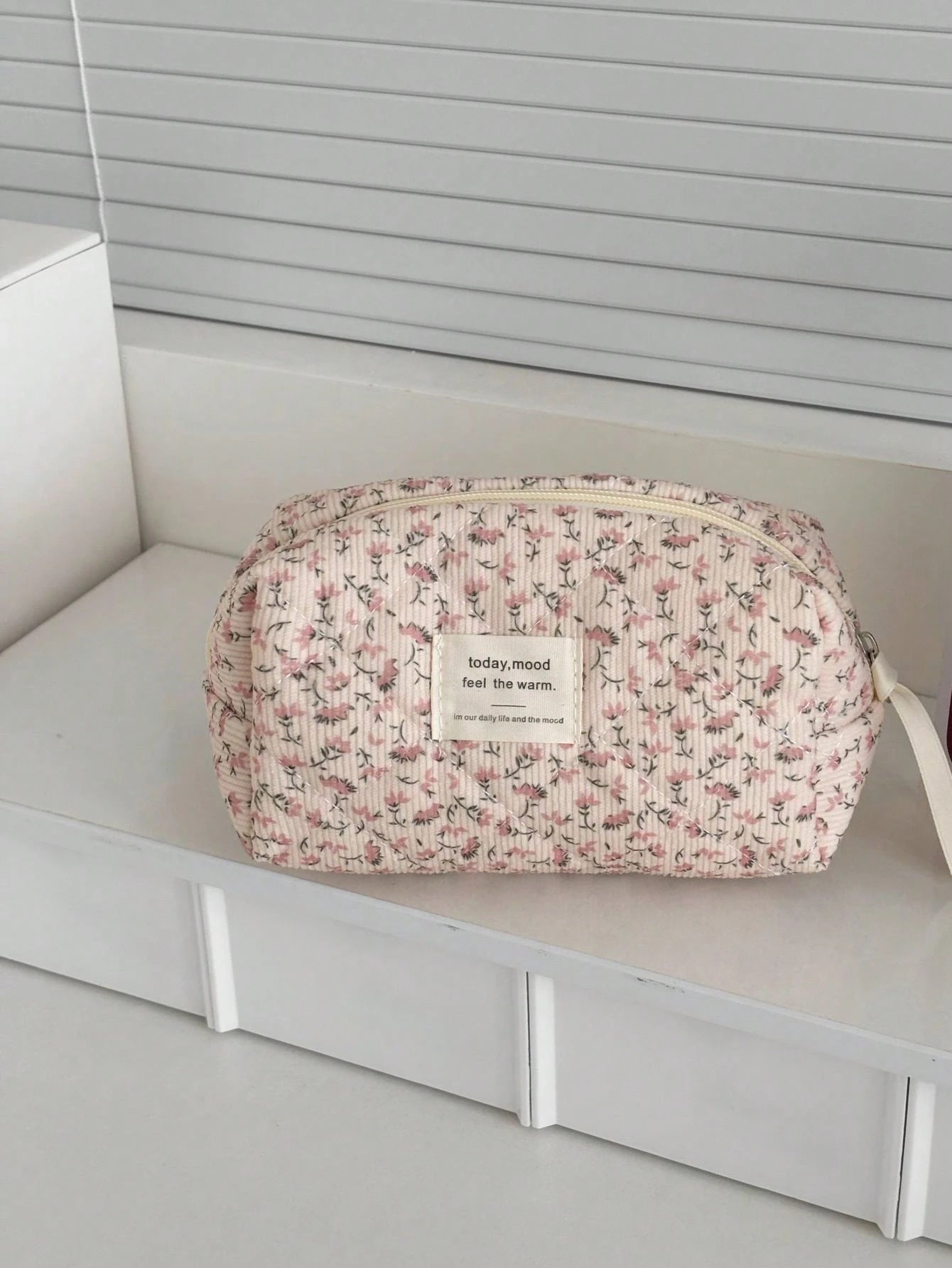Corduroy Pink Floral Cosmetic Pouch - Baby Pink / Small