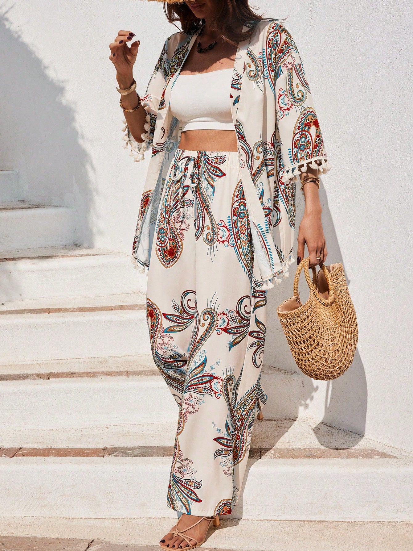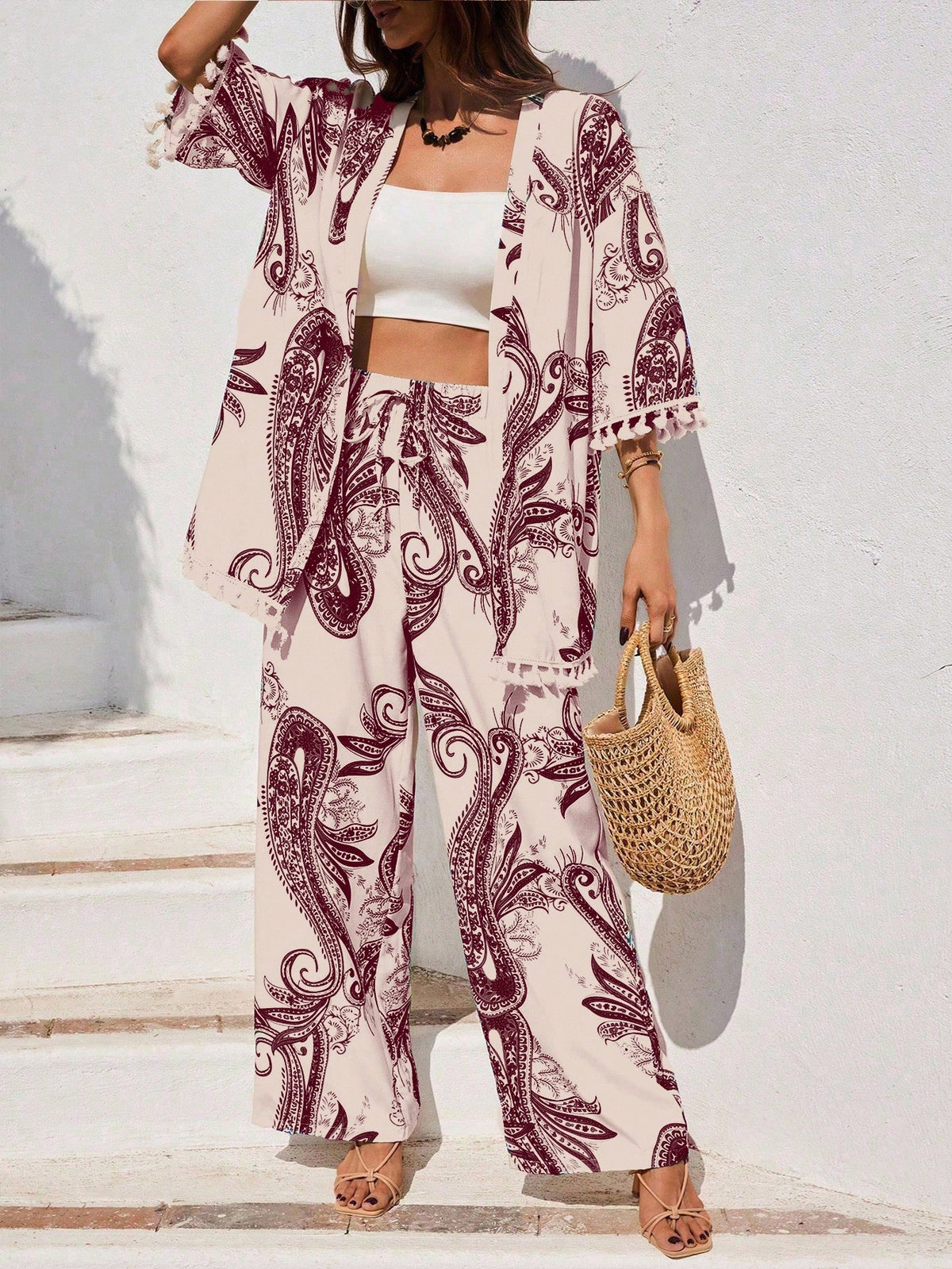Embrace relaxed holiday vibes with this bohemian two-piece set featuring a long duster cardigan adorned with a paisley flower print and fringe cuffs, paired with wide-leg pants for effortless style. Perfect for spring and summer getaways, this set offers a loose fit and chic layered look in one.