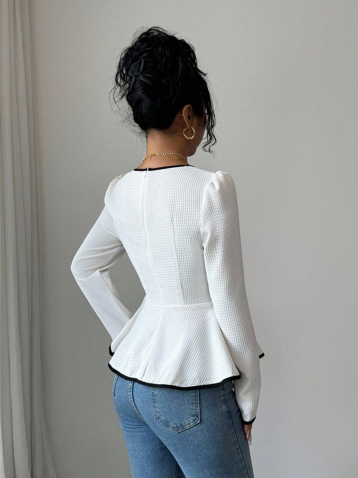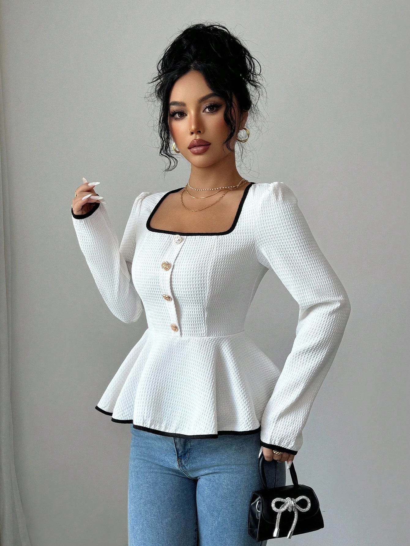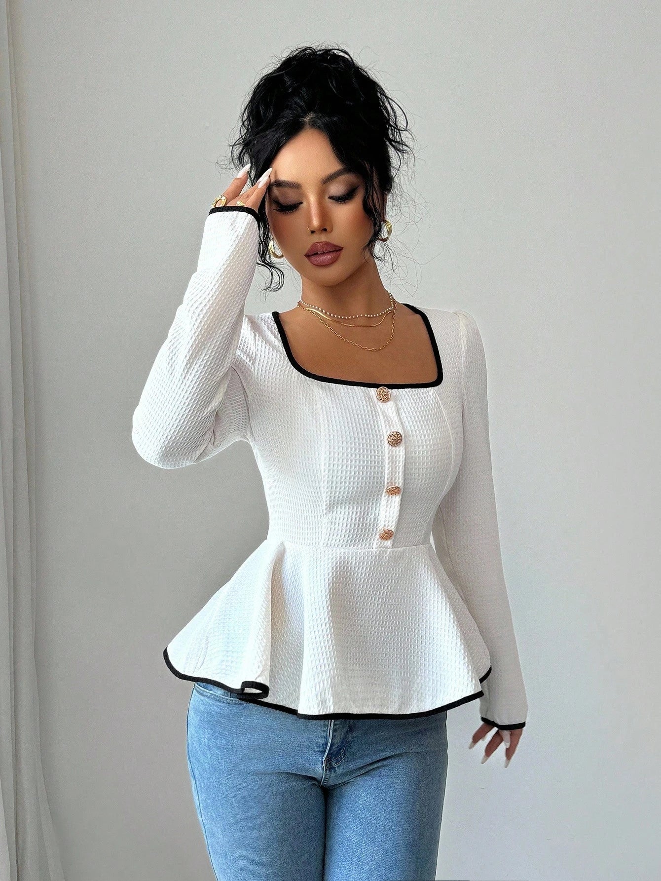 Upgrade your wardrobe with this Elegant Swan Collar Blouse designed for modern women who love timeless fashion. Featuring a stylish metal button-down front, ruffled hem, and long sleeves, this blouse offers a graceful blend of comfort and class.