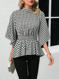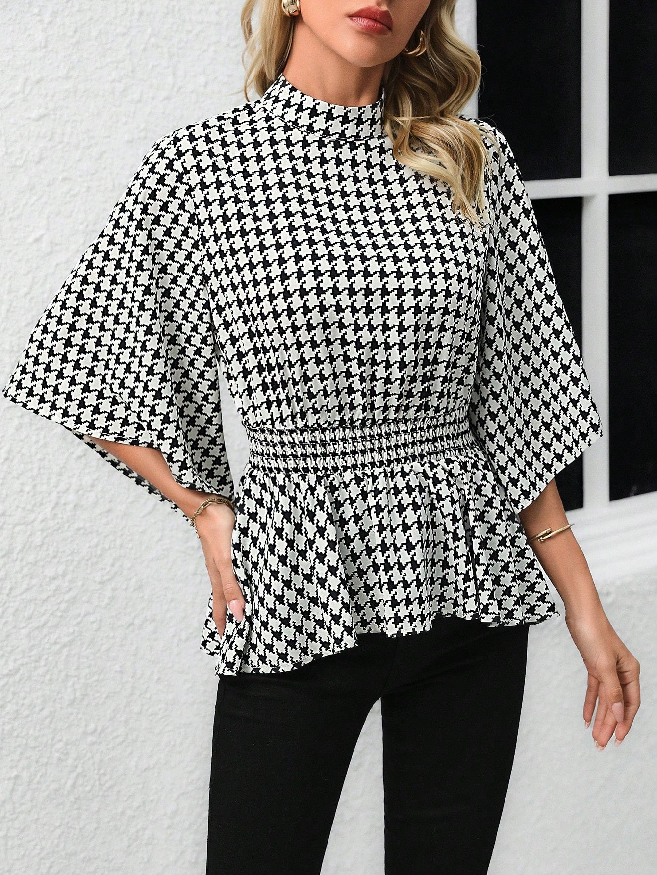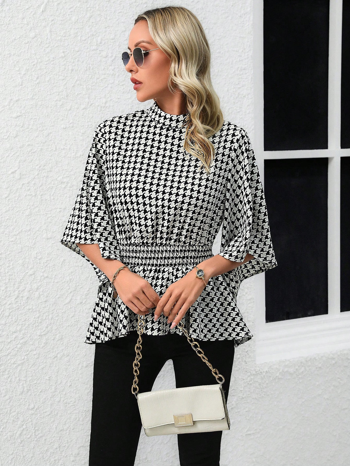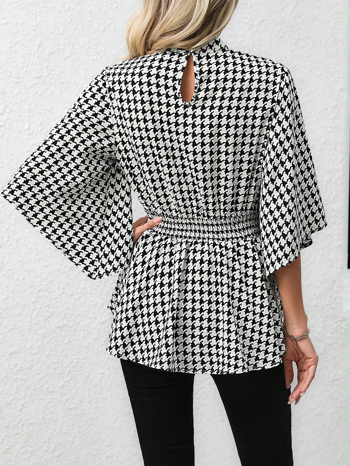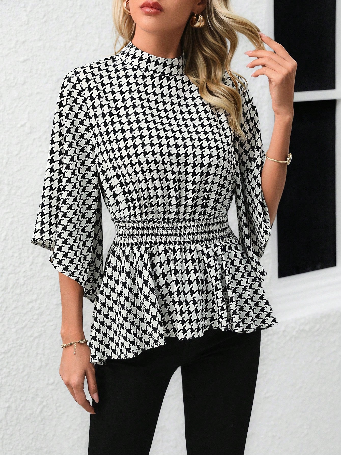 Add timeless elegance to your wardrobe with this women’s houndstooth shirt, perfect for spring and going out. Featuring a stylish ruffle hem, 3/4 sleeves, and a flattering fit, this black top effortlessly combines classic and modern fashion. Ideal for casual outings, lunches, or light formal wear. Pair it with jeans, pants, or skirts for a complete look.