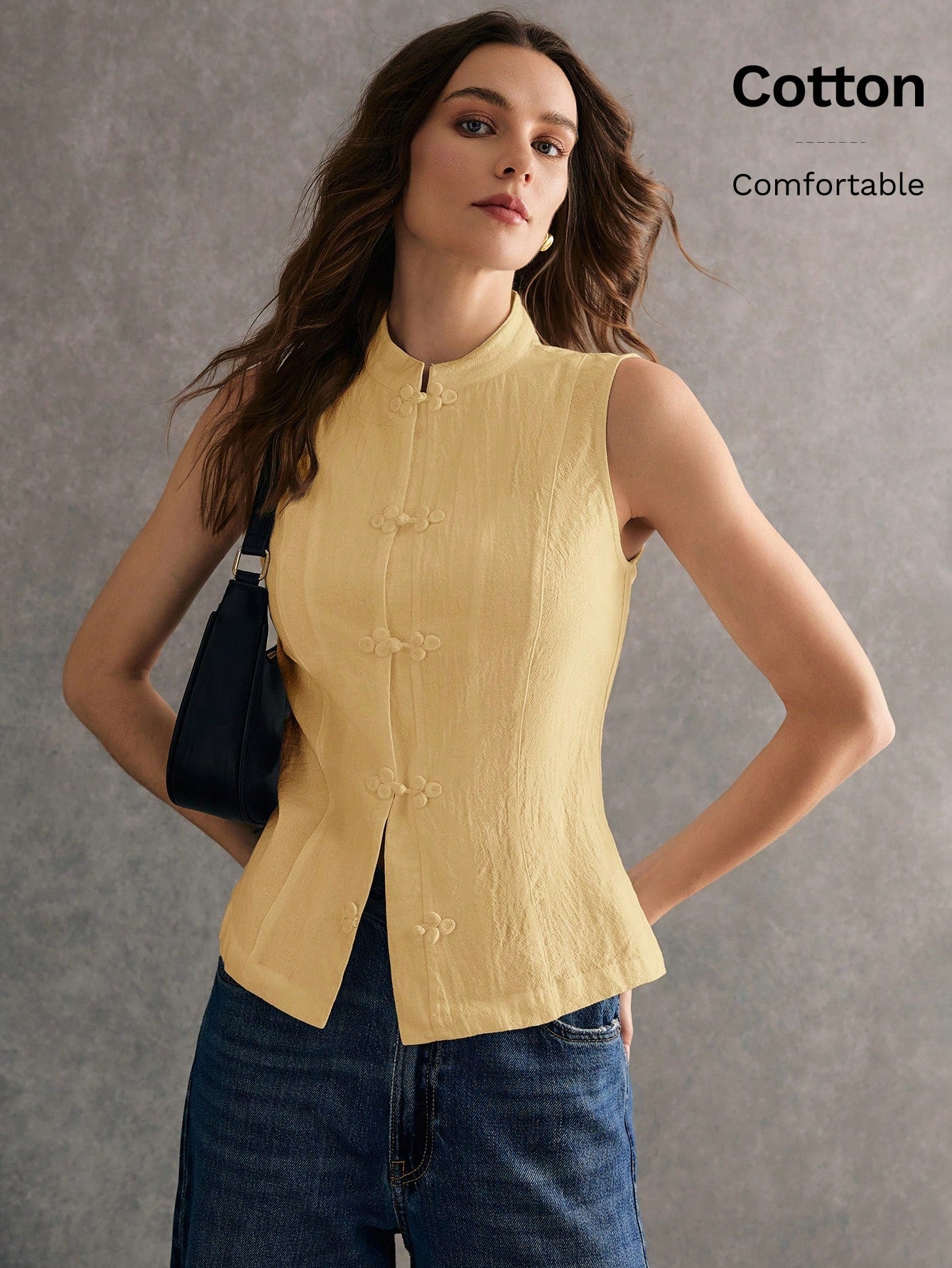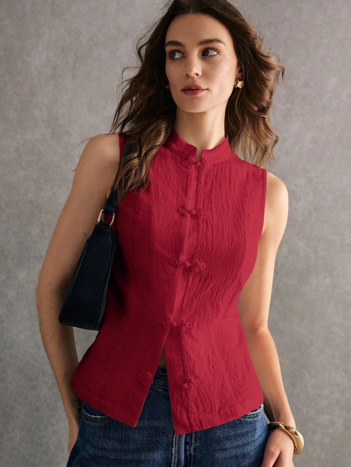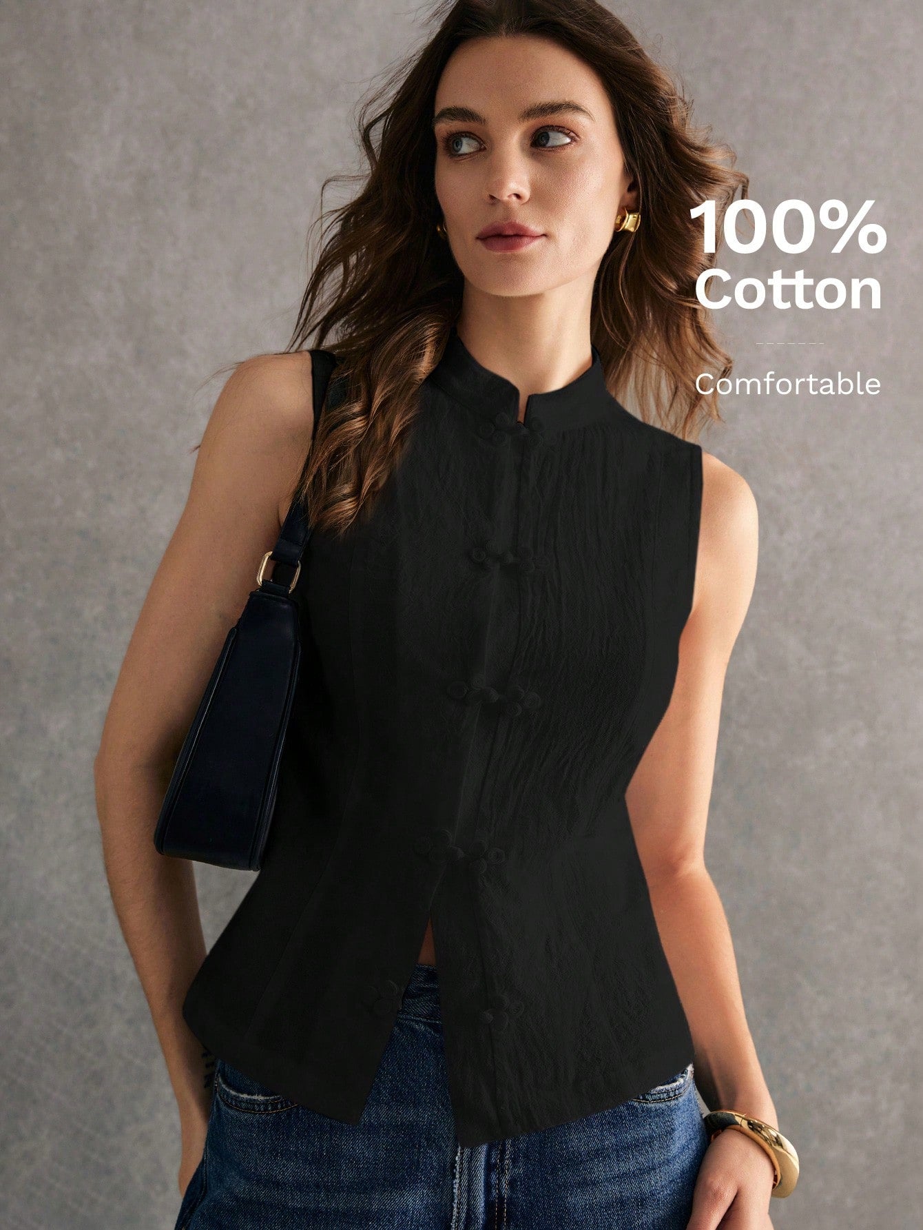 Stay cool and stylish this summer with this elegant sleeveless tank top, featuring a front button placket and modern stand collar. Crafted from comfortable fabric, it’s ideal for daily wear, summer outings, or layering. Pair it with jeans, trousers, or skirts for a versatile look.