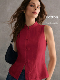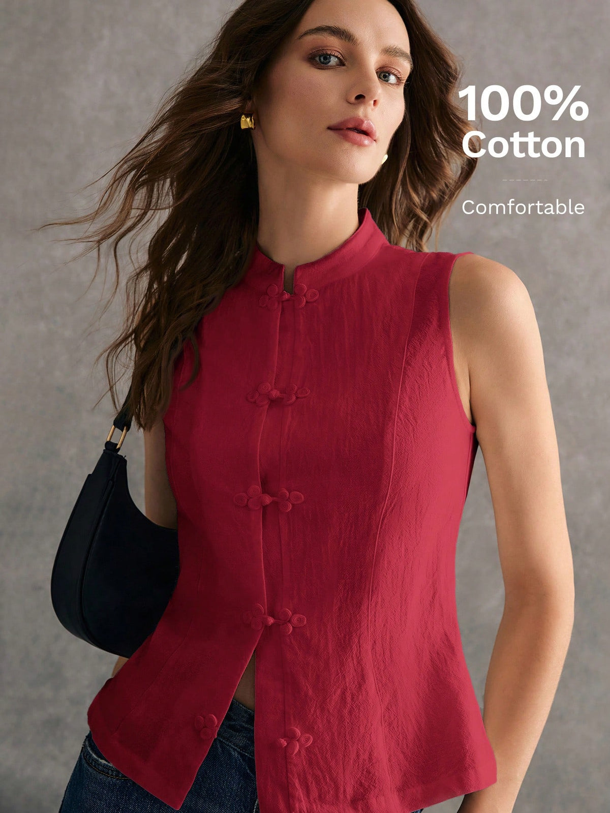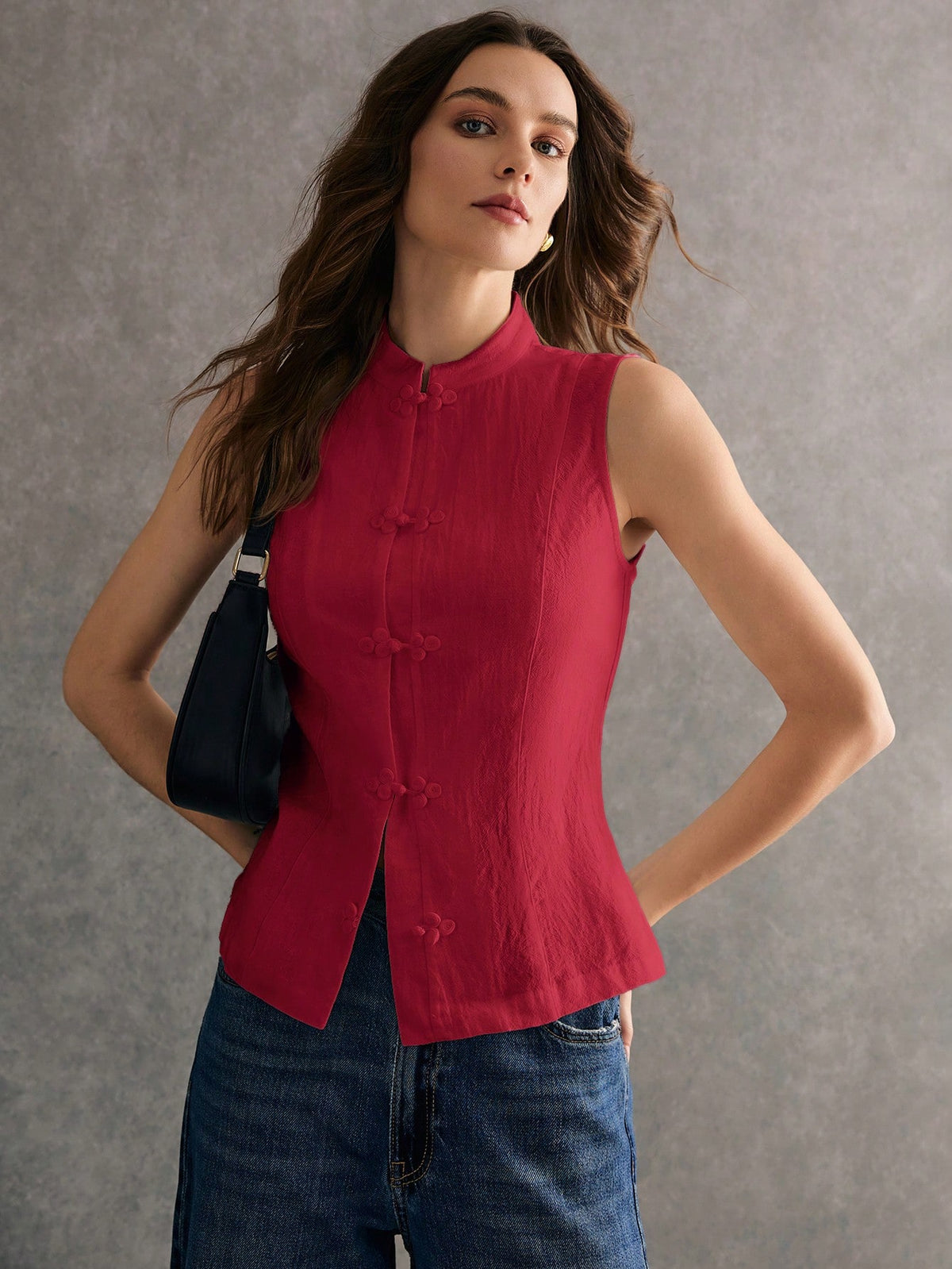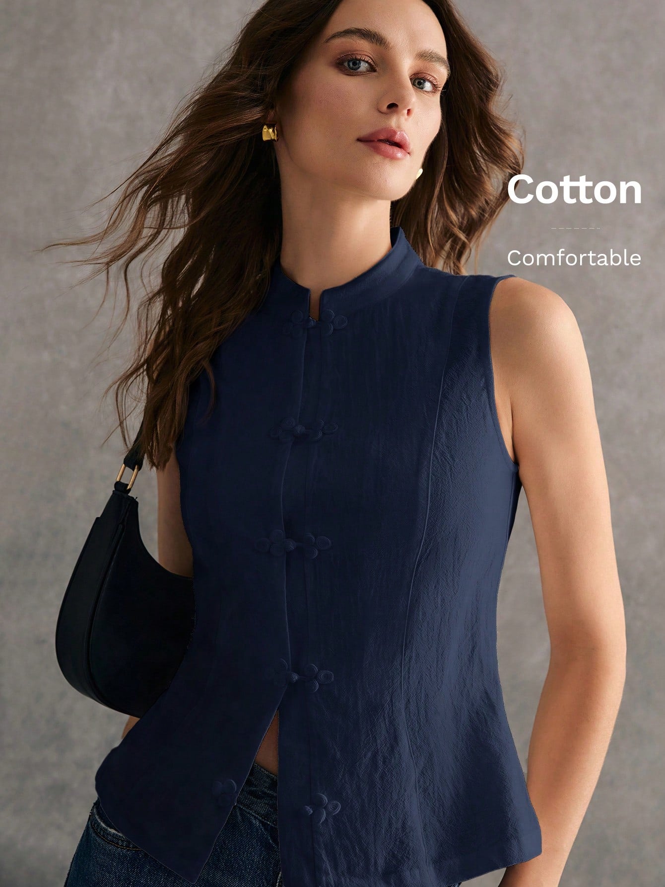 Stay cool and stylish this summer with this elegant sleeveless tank top, featuring a front button placket and modern stand collar. Crafted from comfortable fabric, it’s ideal for daily wear, summer outings, or layering. Pair it with jeans, trousers, or skirts for a versatile look.