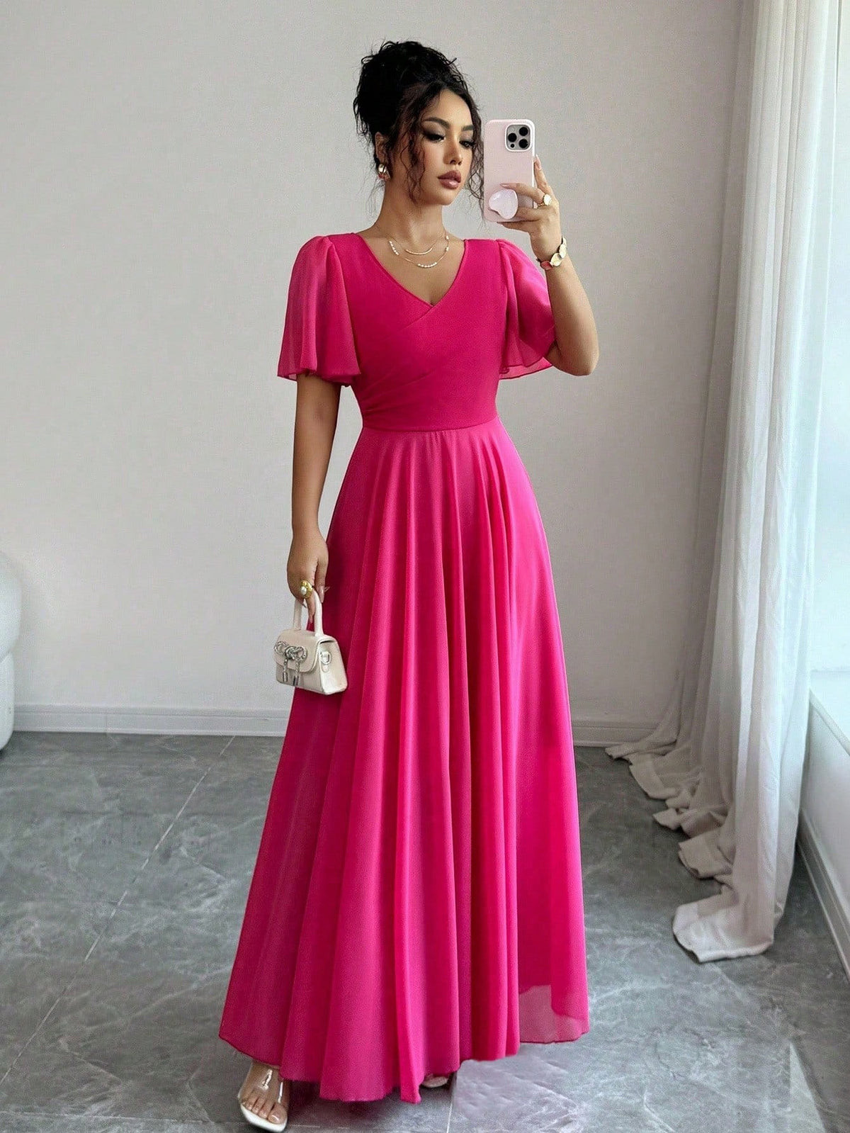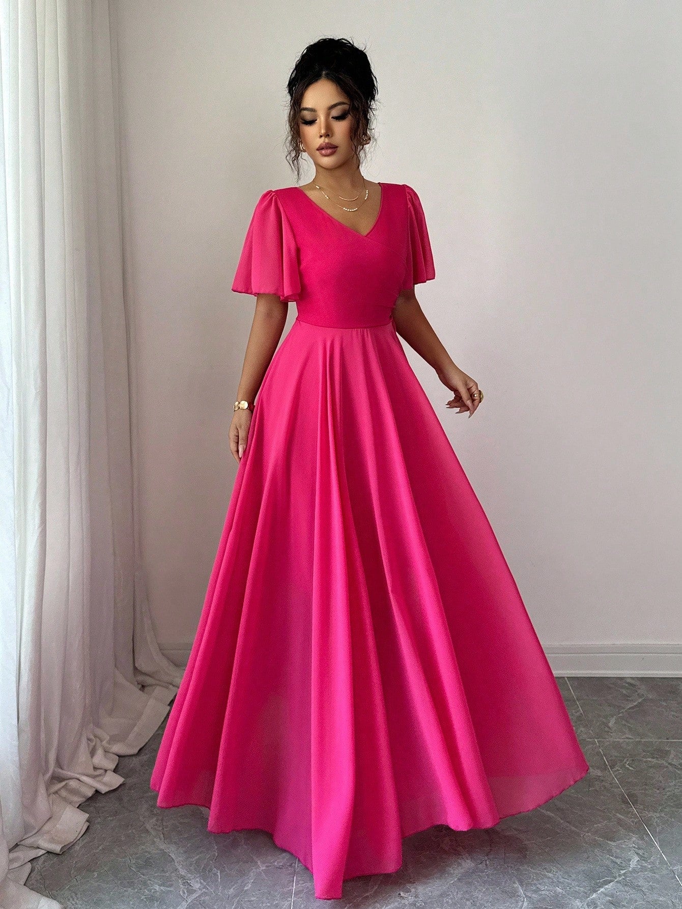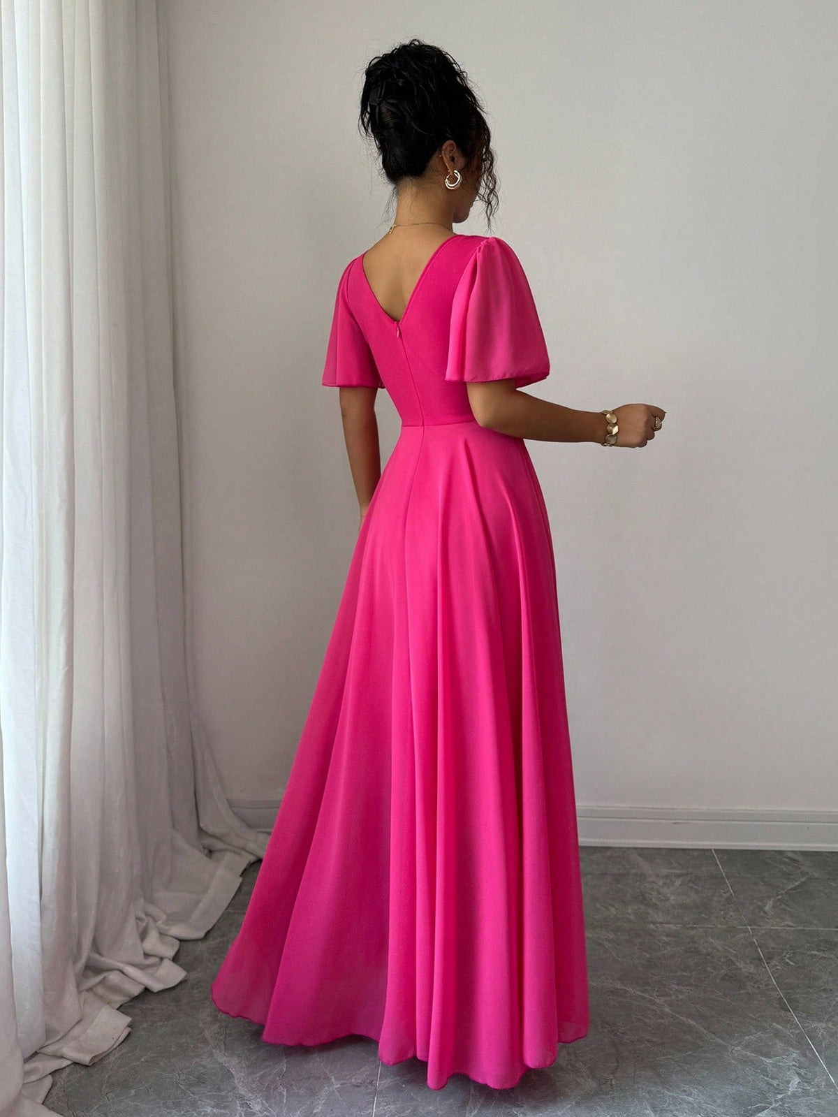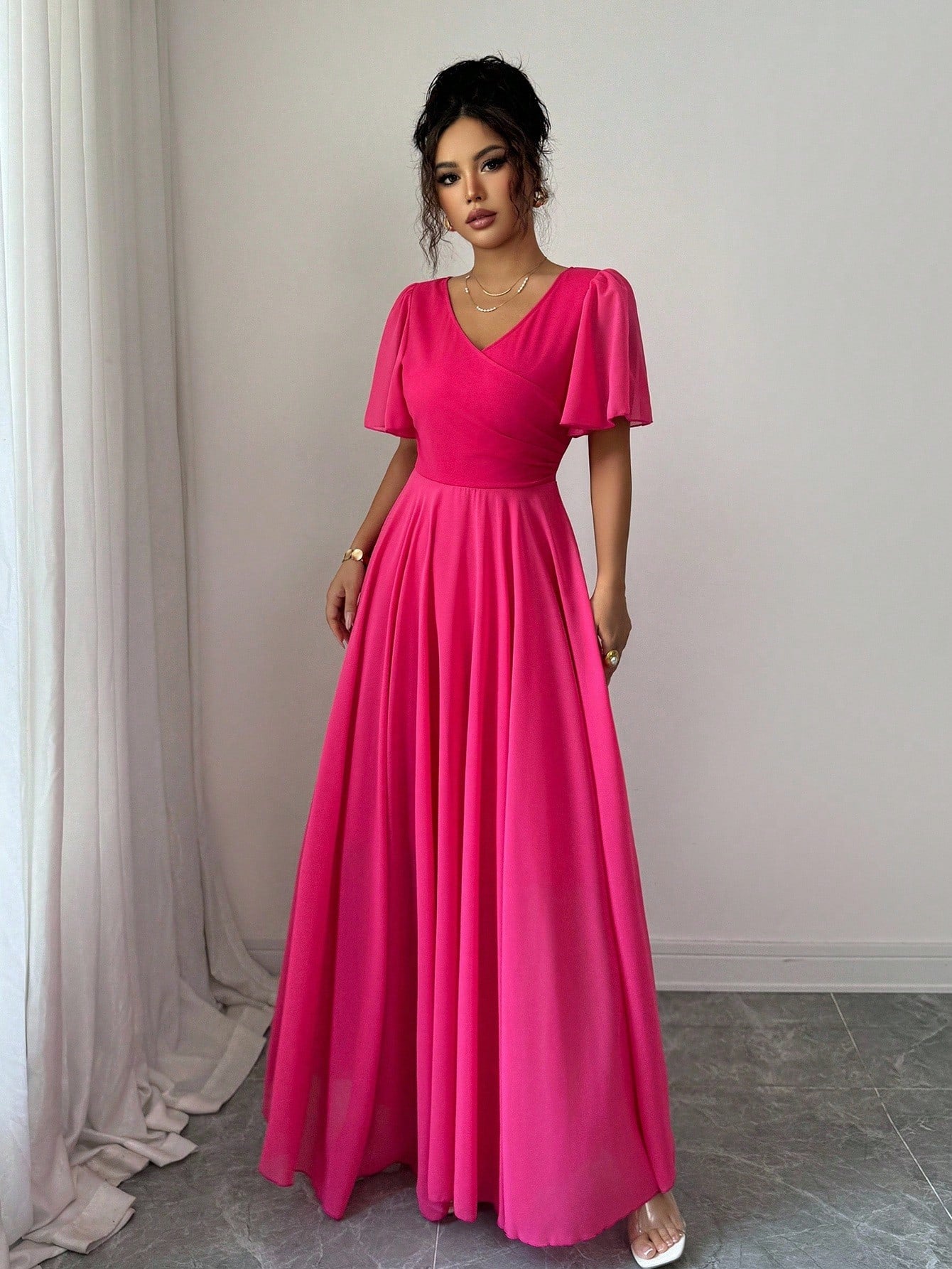 Cinched Waist V-Neck Evening Dress - Hot Pink / S