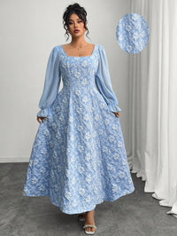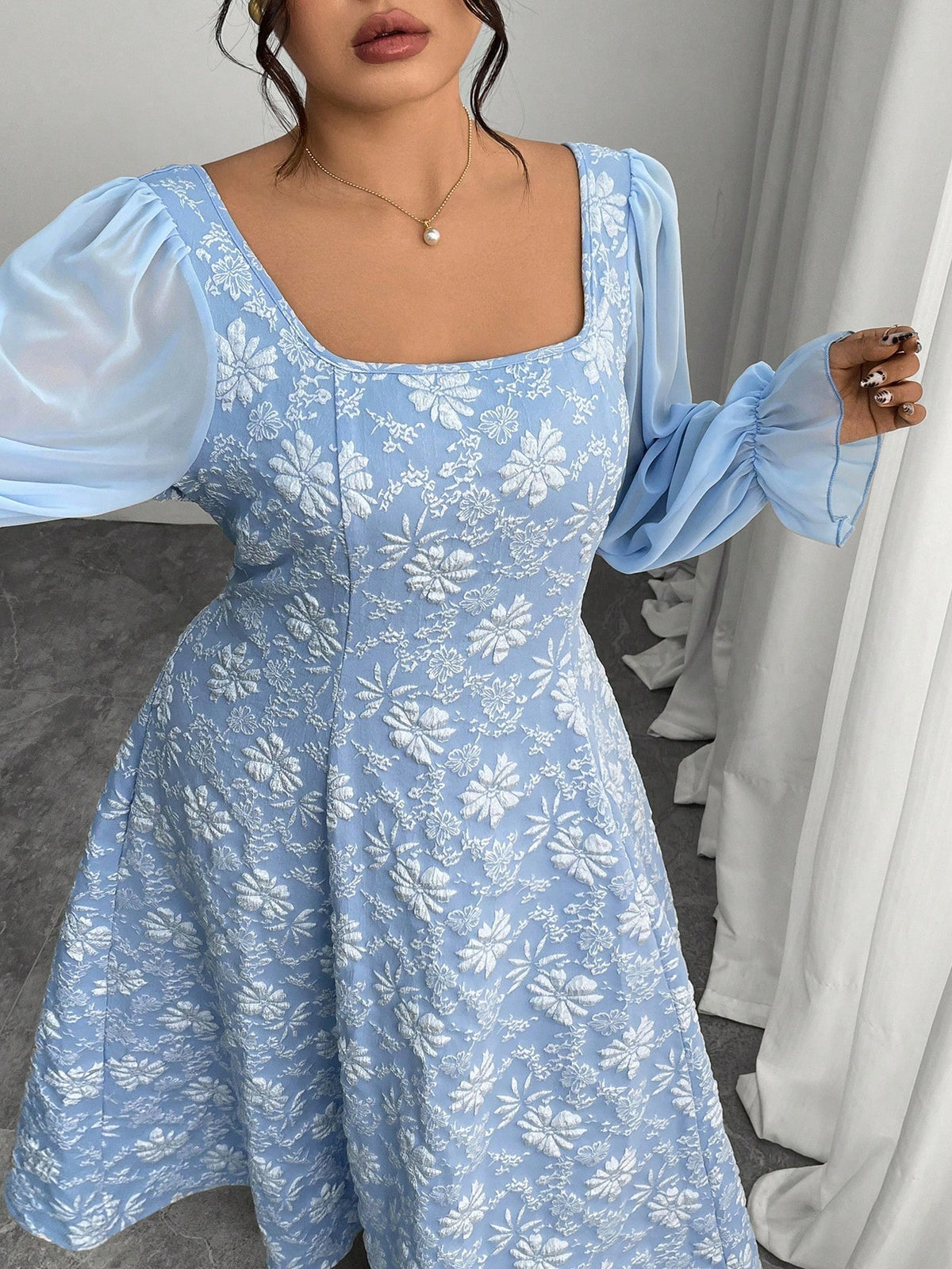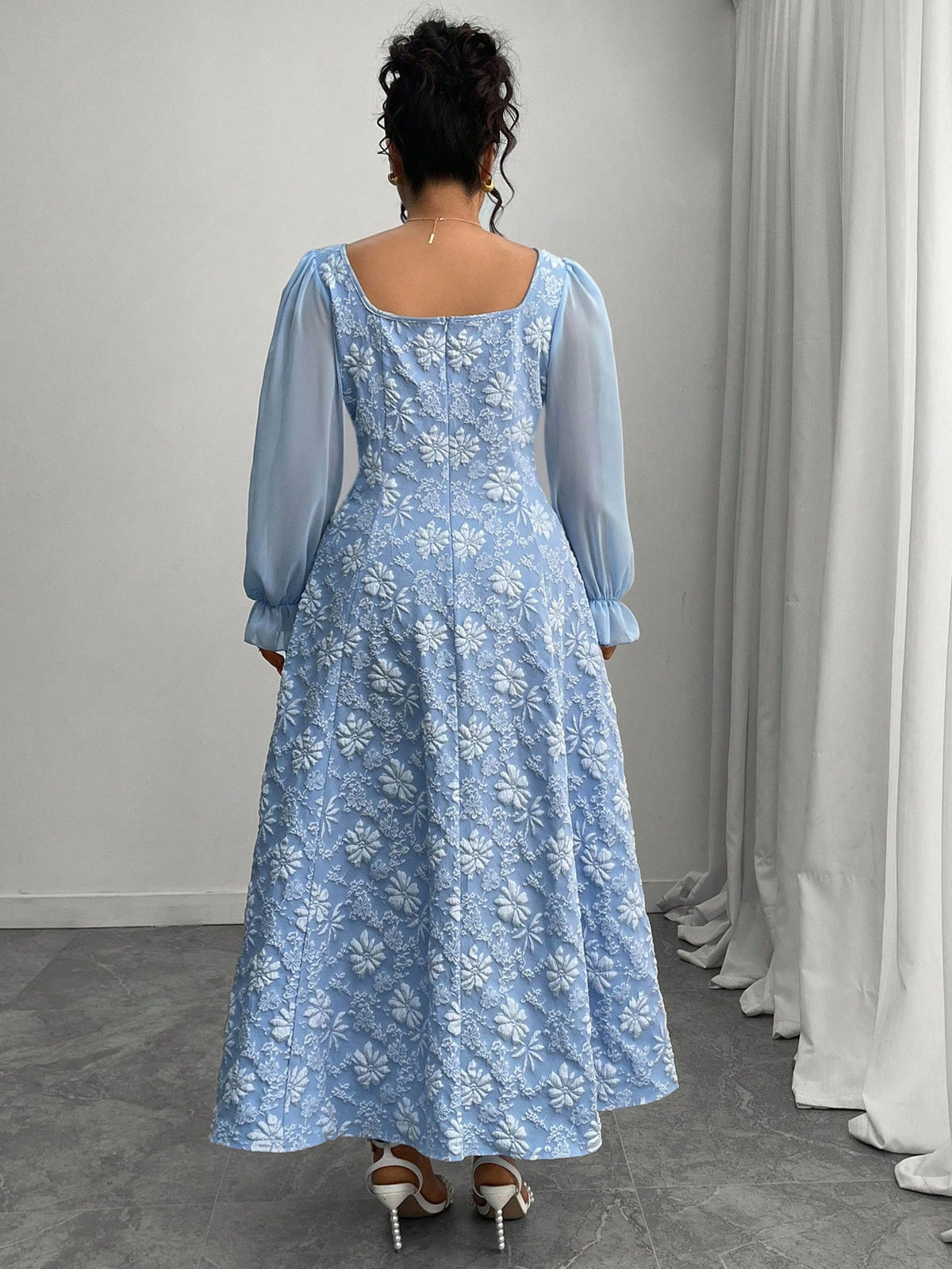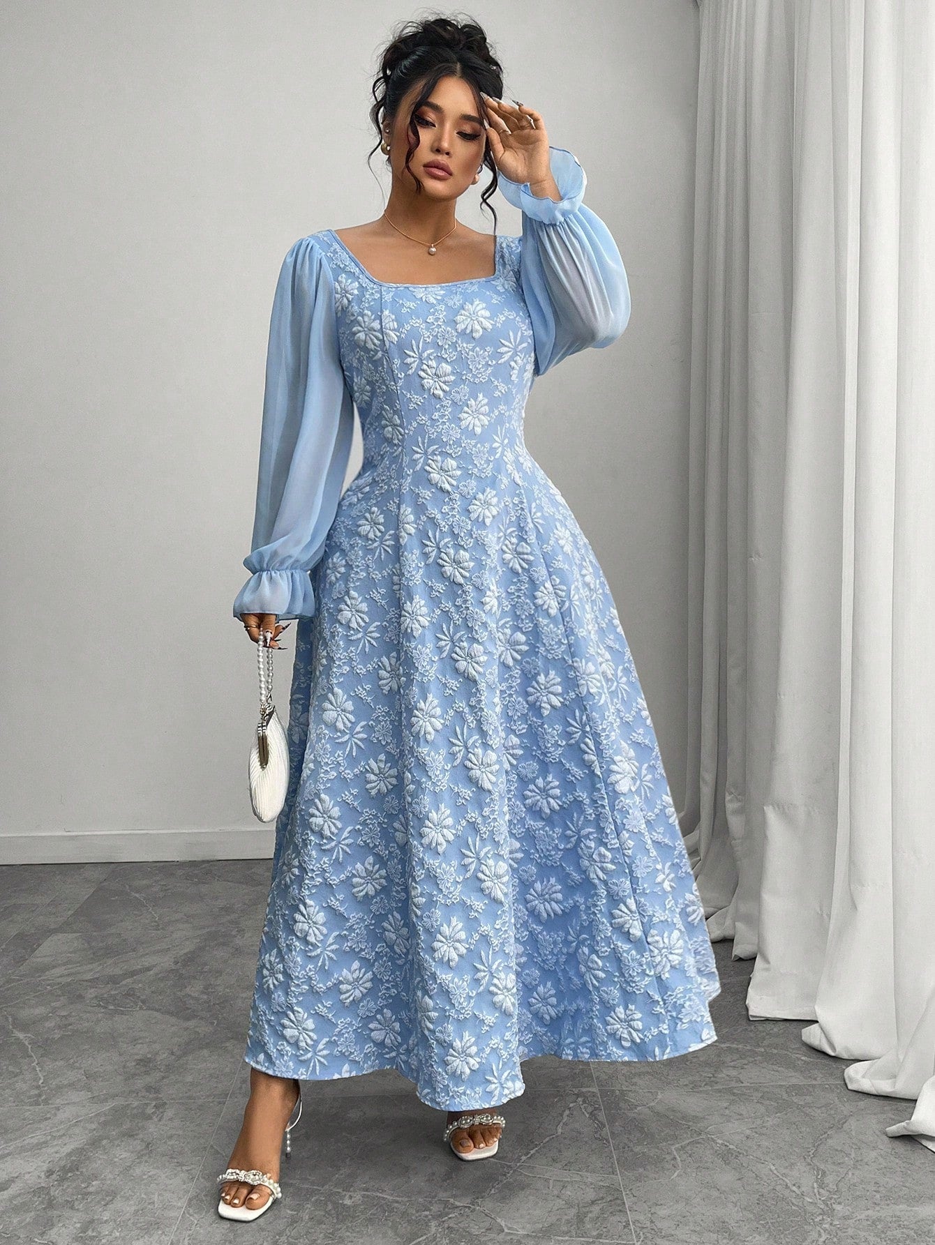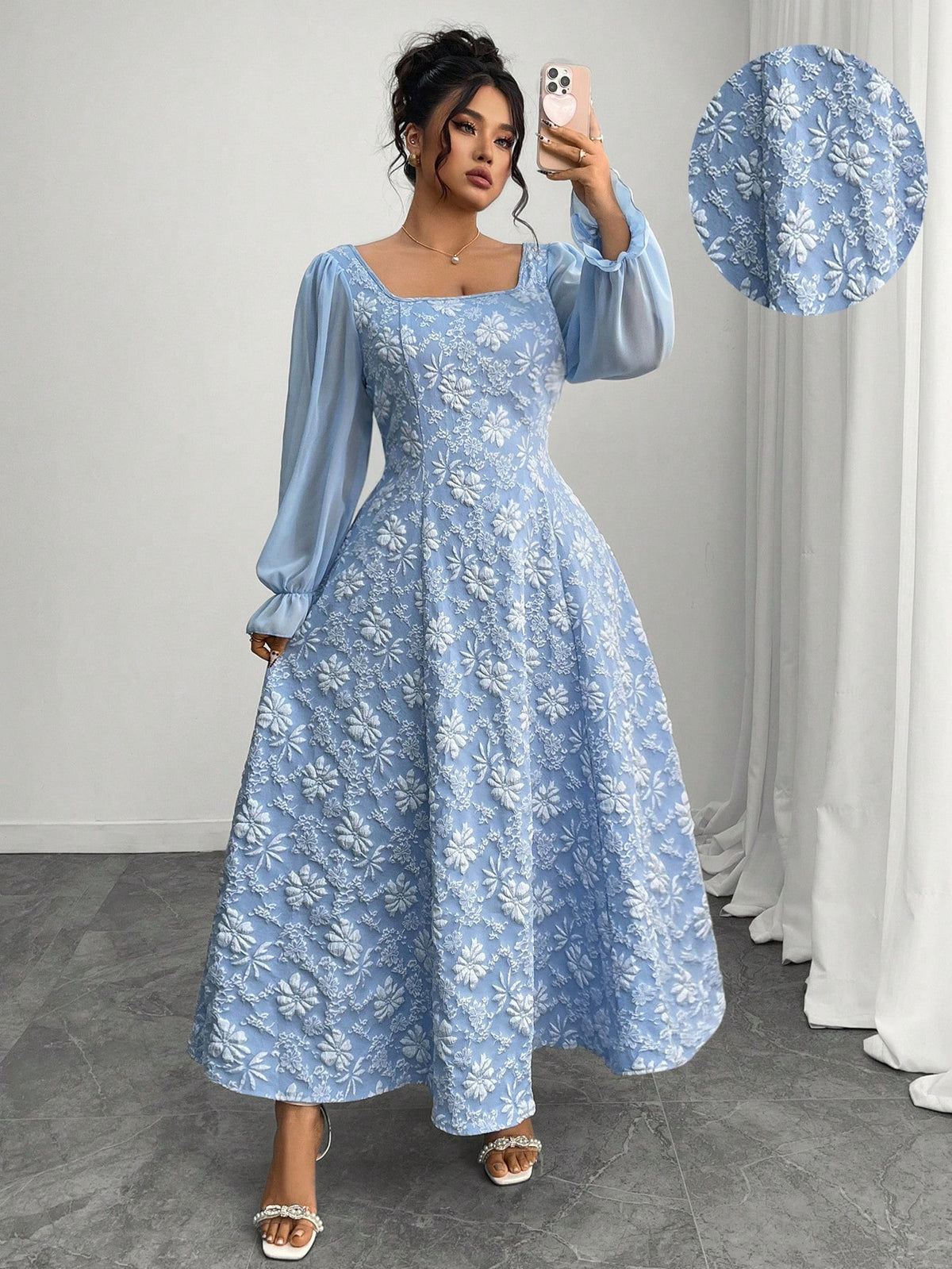 An elegant chiffon-jacquard A-line dress with a graceful drape and long sleeves for a modest, polished look. Perfect for early-autumn/fall events, dinners, and semi-formal days.