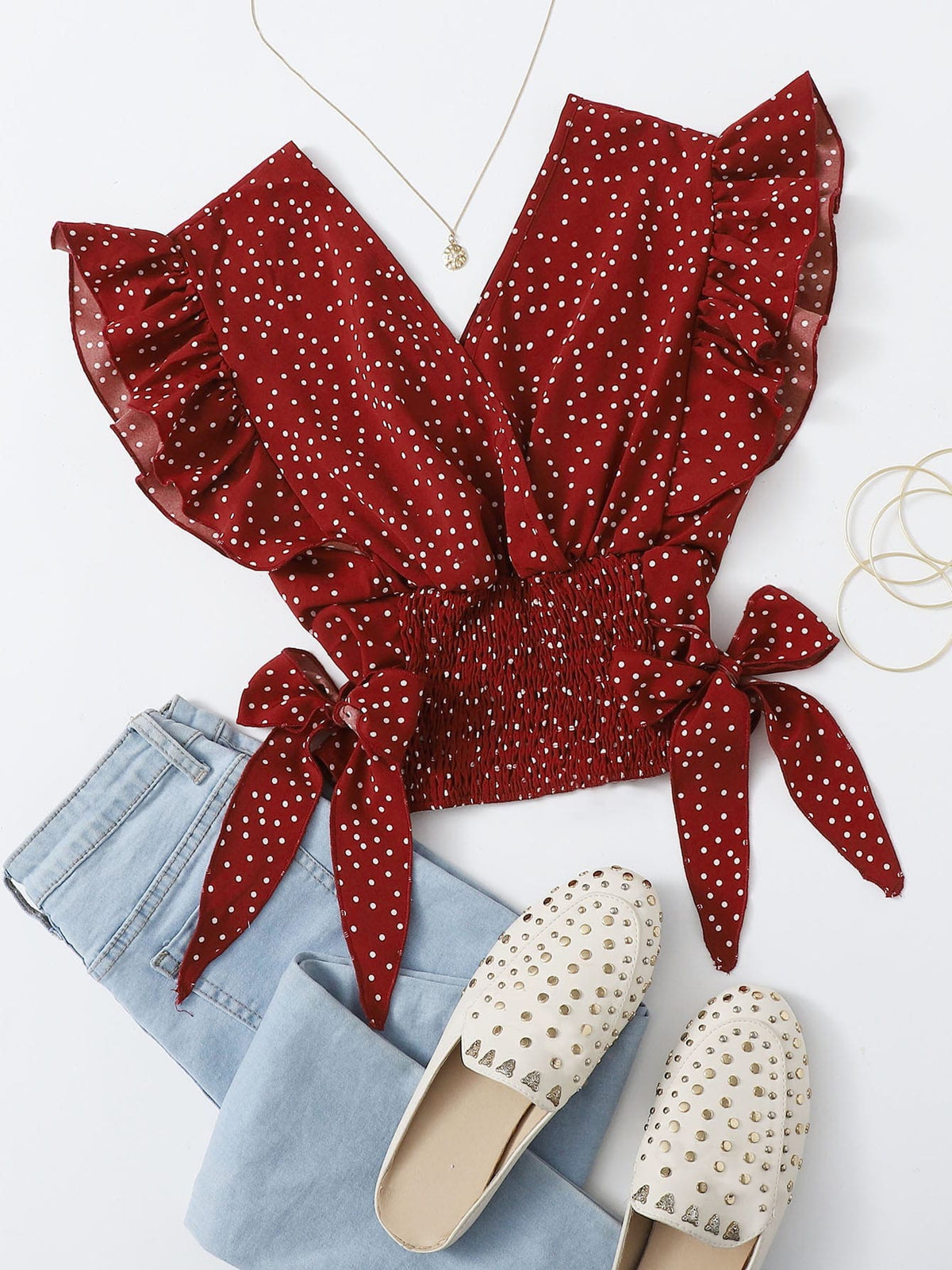 Serving retro meets flirty chic, this polka dot top is a whole vibe. With its ruffle trim, shirred fit, and knotted front detail, it’s basically the definition of “cute but make it fashion.” Pair it with jeans, skirts, or high-waist trousers — this top knows how to play well with others.