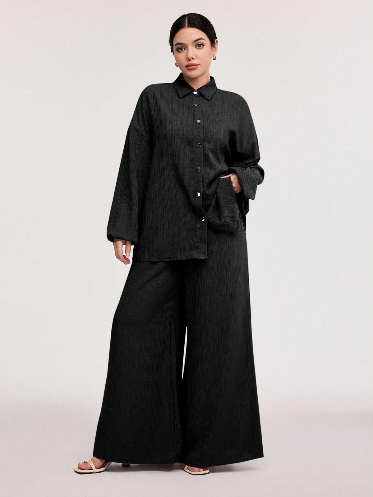 Textured Lantern Sleeve Pants Set - Black / S