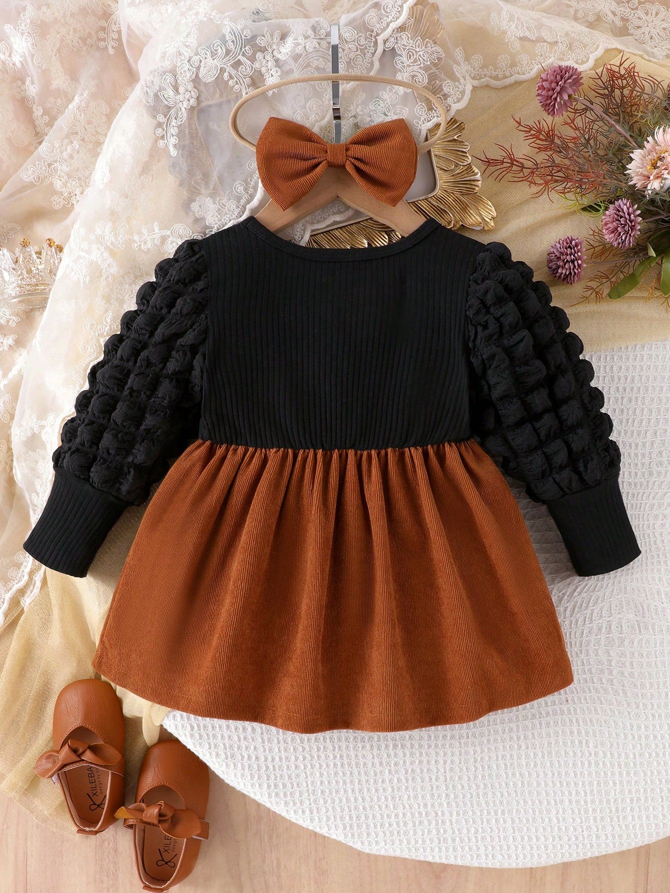 Make every moment extra special with this adorable 2-piece baby girl dress set. Featuring a chic black corduroy patchwork dress with charming bow detail, and a matching bow headband, this outfit adds style and sweetness to your little one’s wardrobe. Perfect for family photos, birthdays, parties, and everyday wear, it’s both comfortable and stylish for your baby’s special occasions.