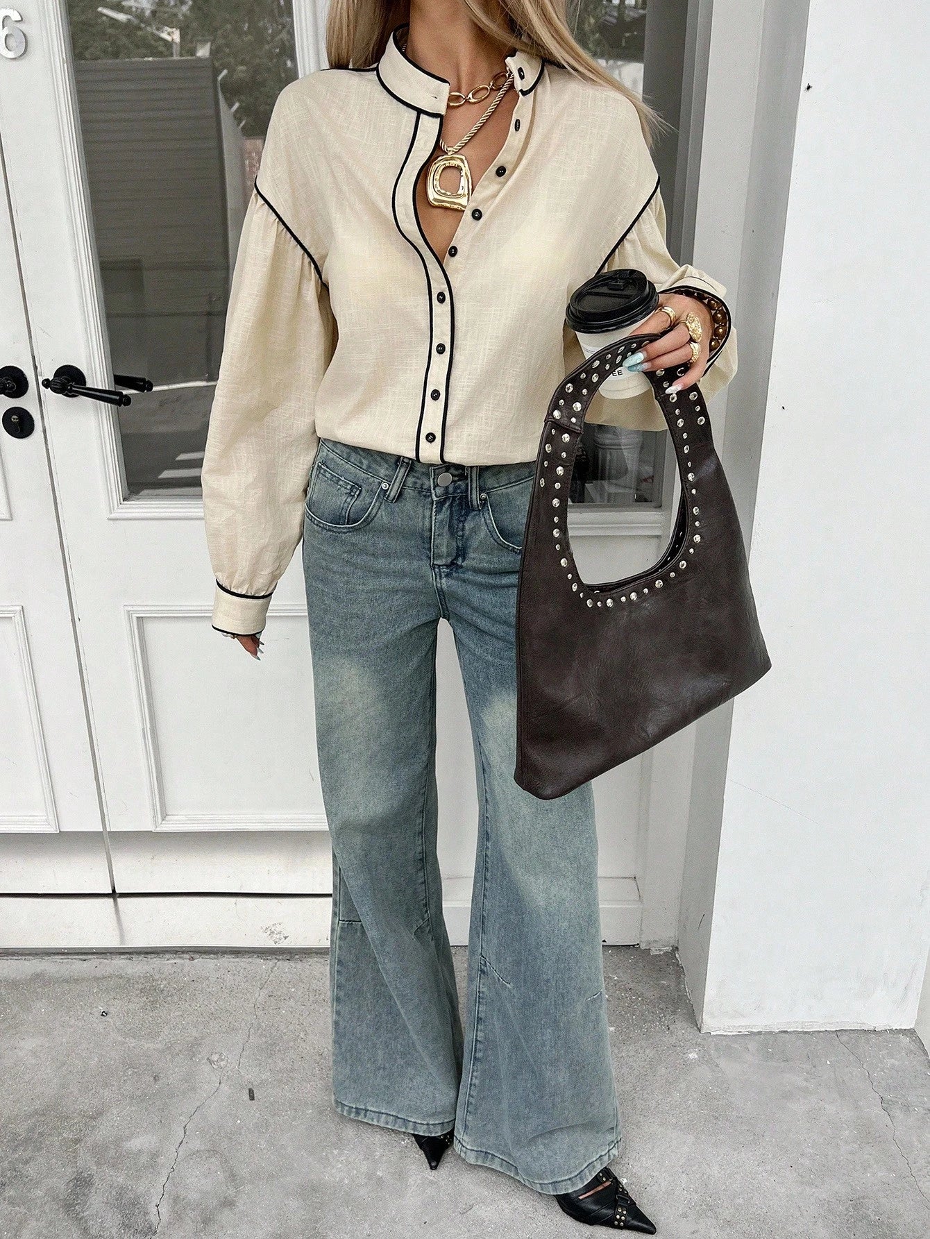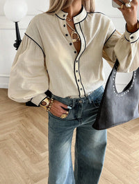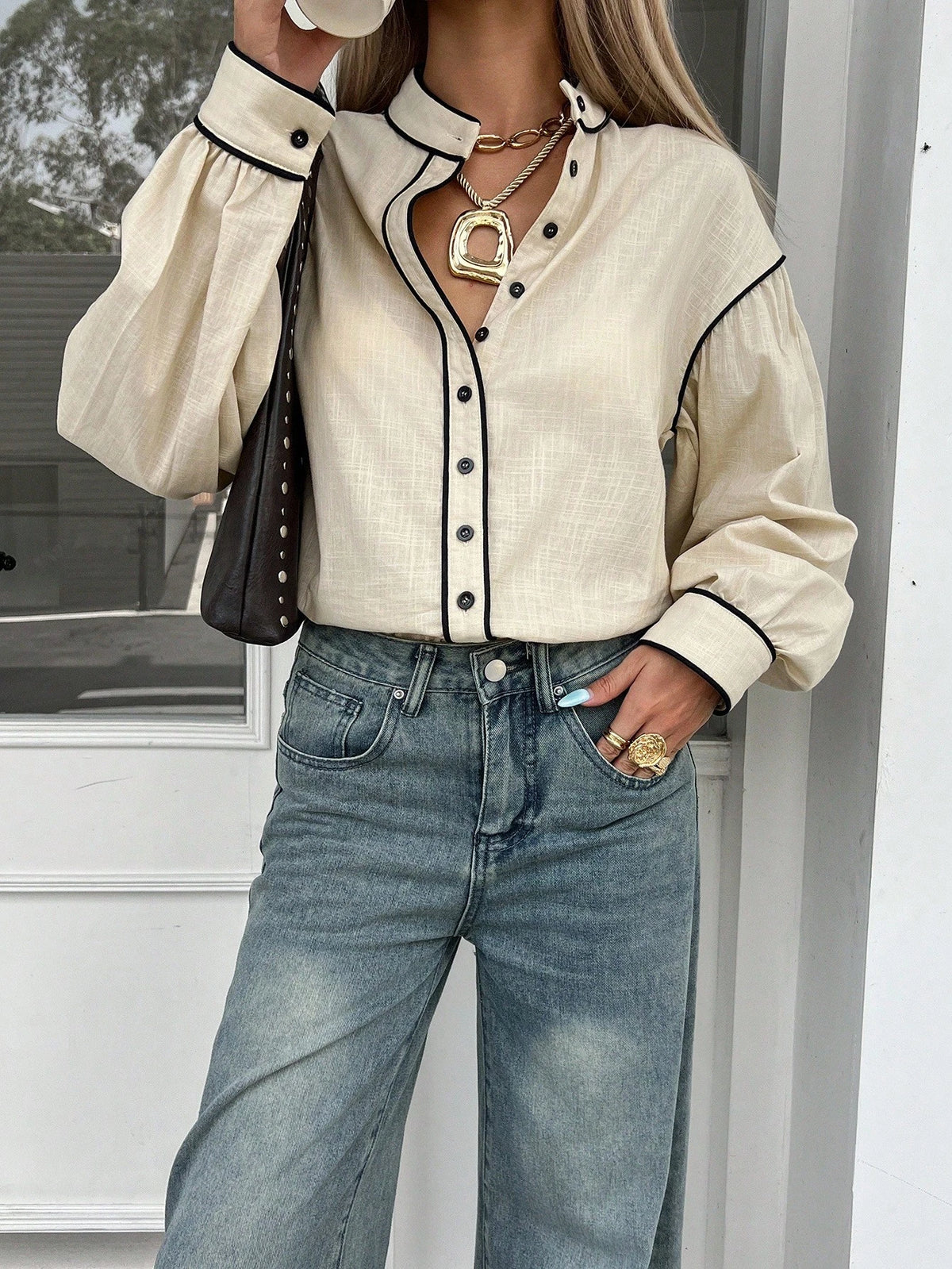 Elevate your winter wardrobe with this stylish 100% cotton blouse featuring a contrast color trim, stand collar, and full button-up front. Designed with comfort and modesty in mind, it's perfect for Pakistani winters, whether you're heading to university, work, or a casual day out. This versatile piece works well for both western-inspired looks and traditional layering styles.