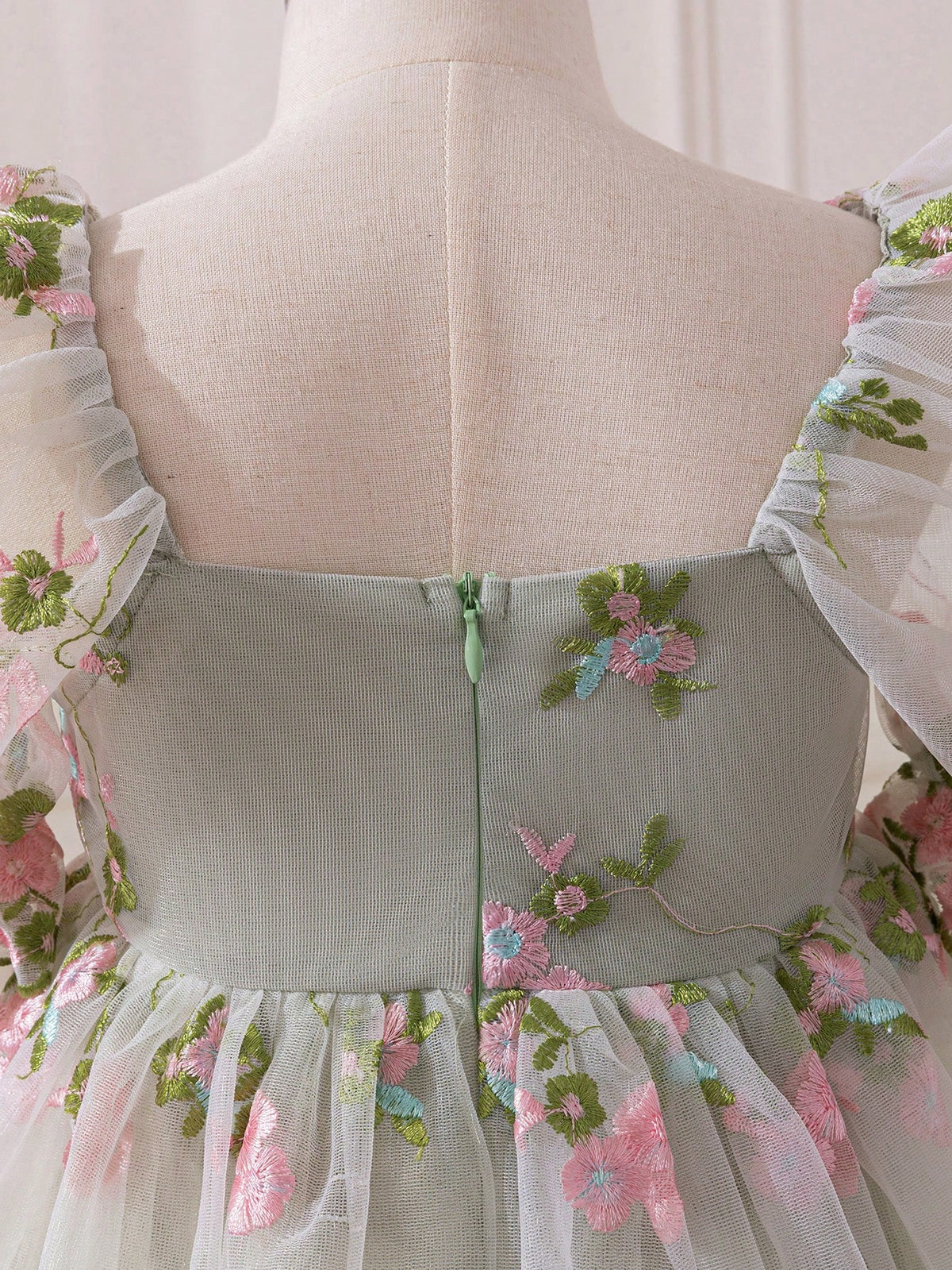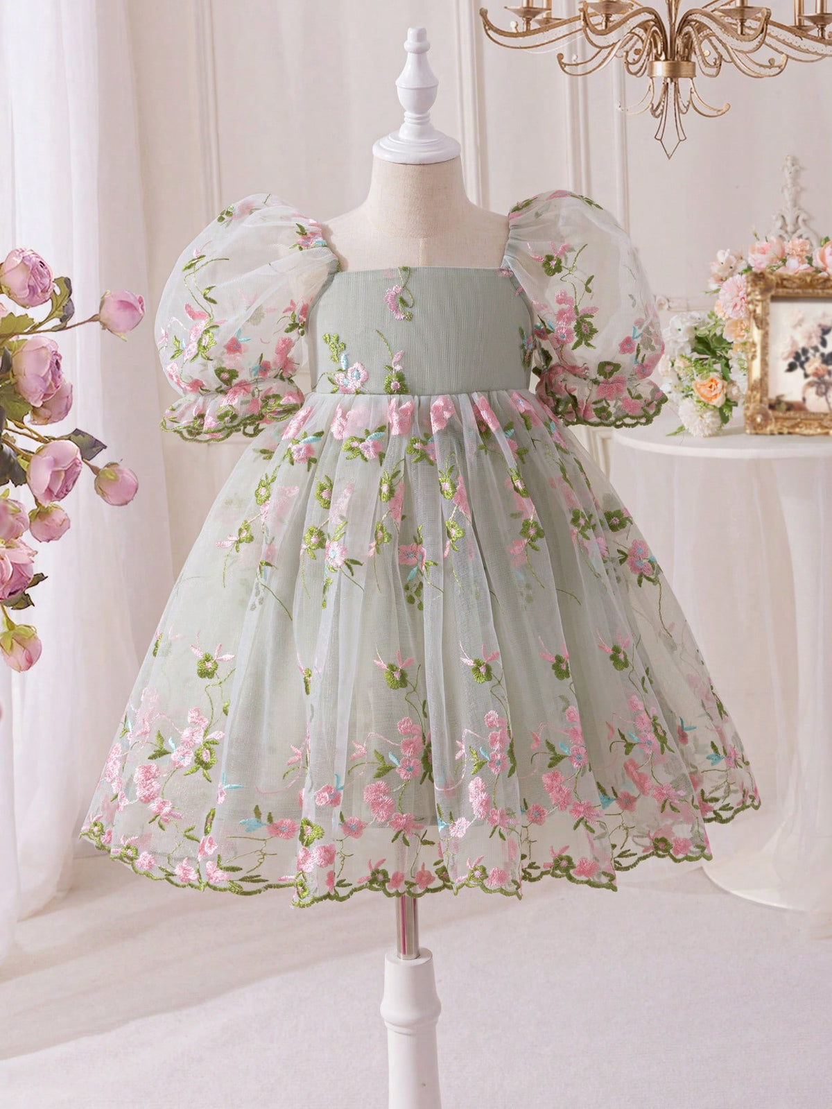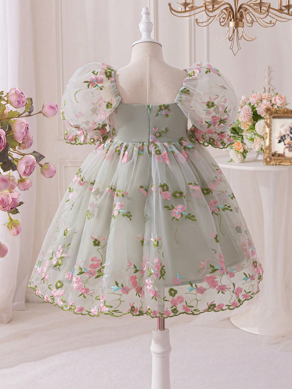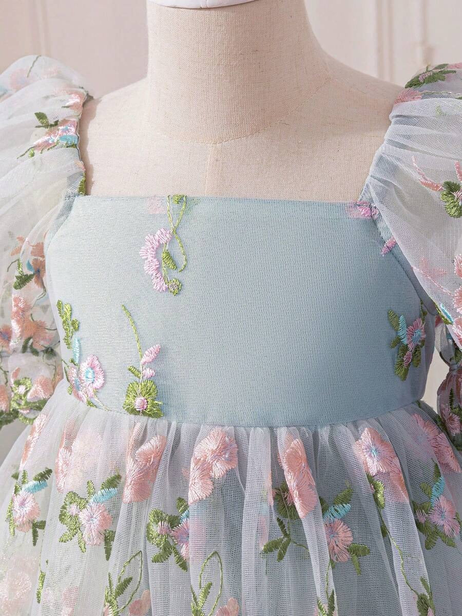 A dreamy, picture-perfect dress for your little princess. This elegant design features a delicate embroidered net overlay, a classic square neckline, and soft puff sleeves — ideal for birthdays, homecoming, parties, and as a beautiful flower girl look.