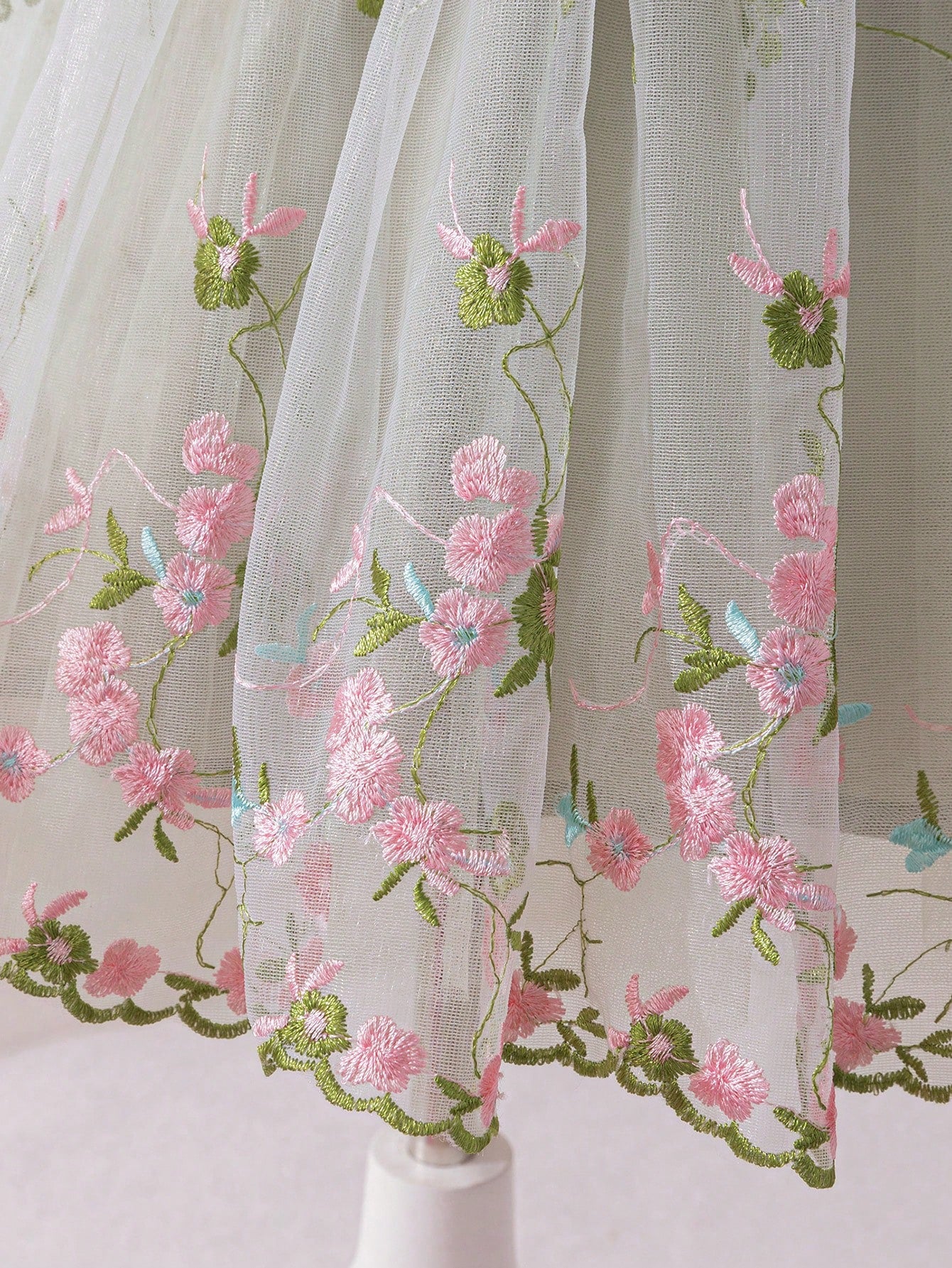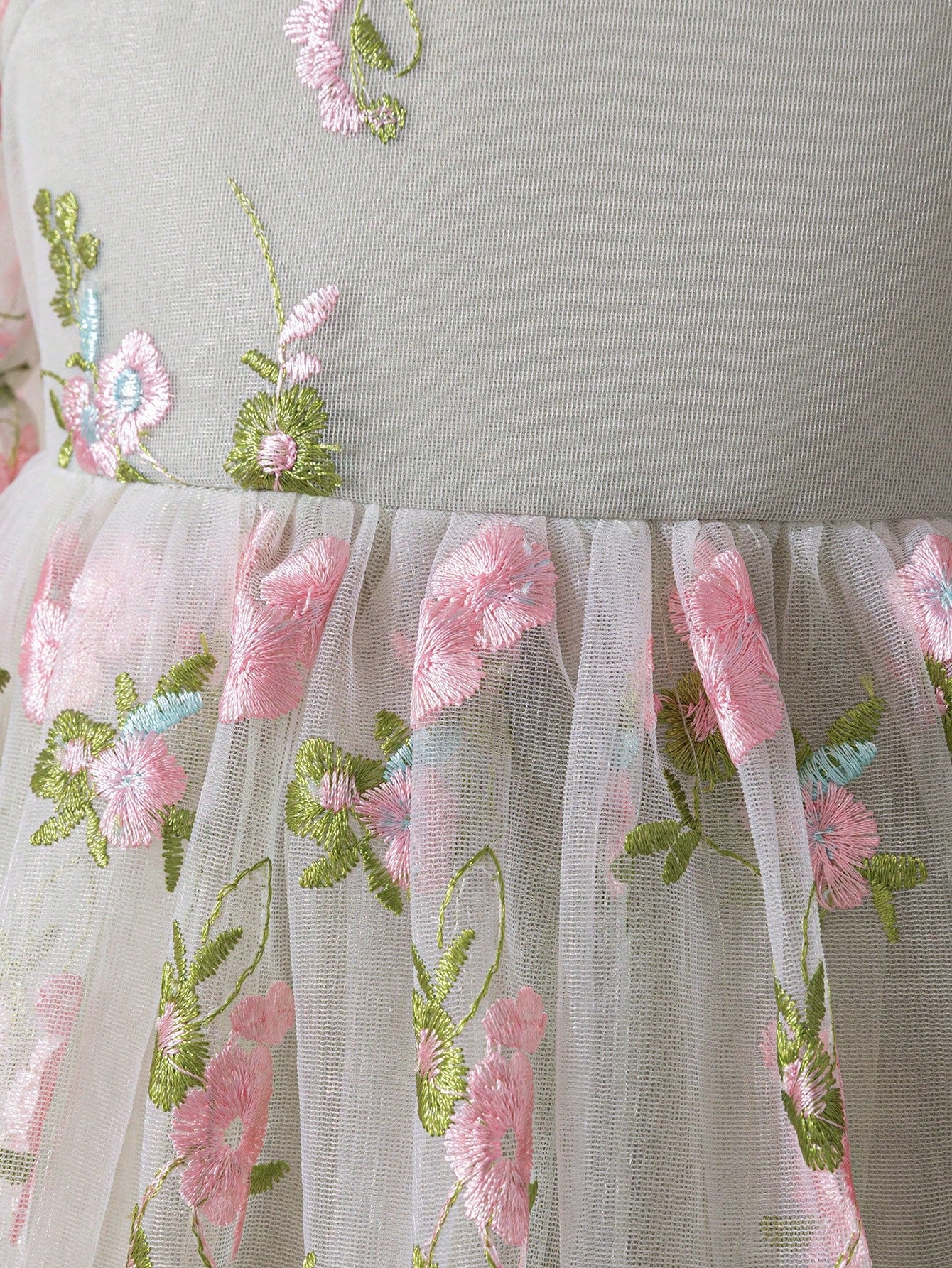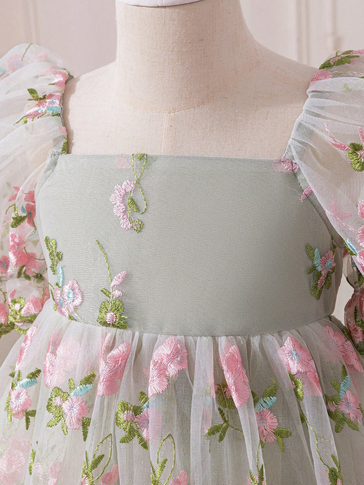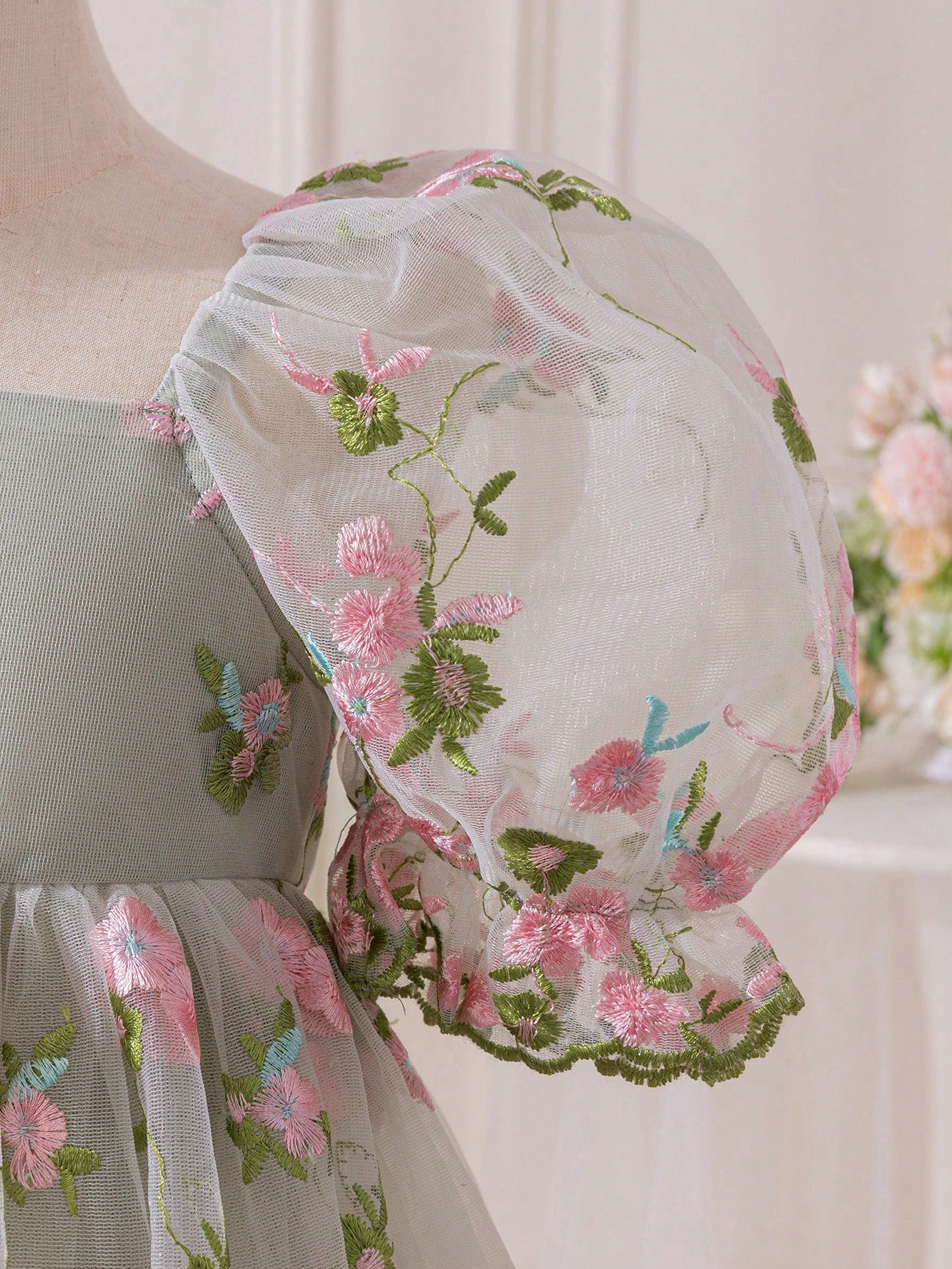 A dreamy, picture-perfect dress for your little princess. This elegant design features a delicate embroidered net overlay, a classic square neckline, and soft puff sleeves — ideal for birthdays, homecoming, parties, and as a beautiful flower girl look.