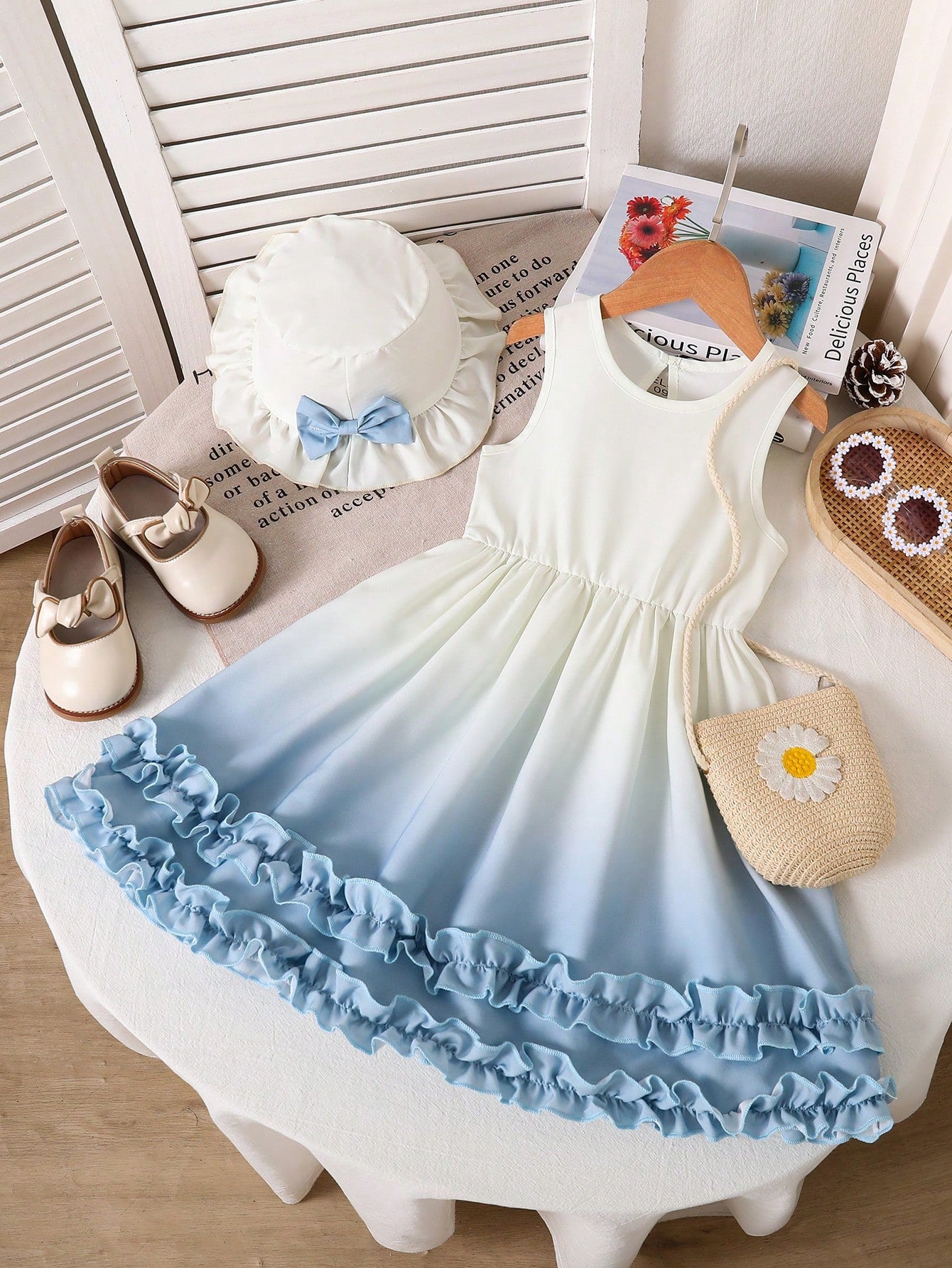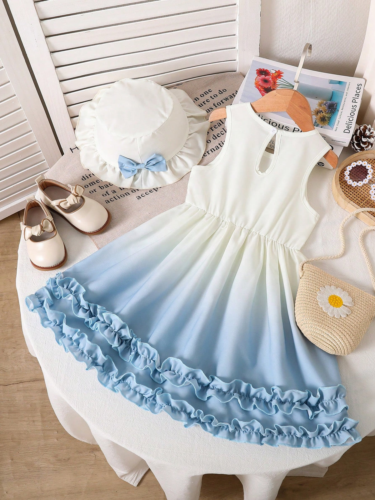 Dreamy, floaty, and summer-perfect. This sweet ombré dress pairs a blue-to-white fade with a matching bow headband and a double ruffle hem—made for beach trips, birthdays, photo shoots, and festive days.